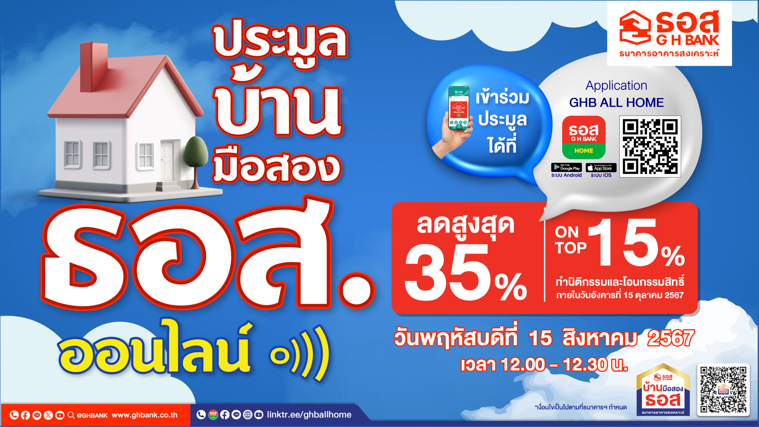 ของธนาคาร” (เงื่อนไขเป็นไปตามหลักเกณฑ์ที่ธนาคารกำหนด) โดยสอบถามข้อมูลเพิ่มเติมได้ที่ G H Bank Call Center โทร.0-2645-9000 กด 5 หรือ Facebook Fanpage ธนาคารอาคารสงเคราะห์ หรือดูข้อมูลบ้านมือสอง ธอส. ได้ที่ www.ghbhomecenter.com, Mobile Application : GHB ALL HOME และ Line Official Account : @GHBALLHOME