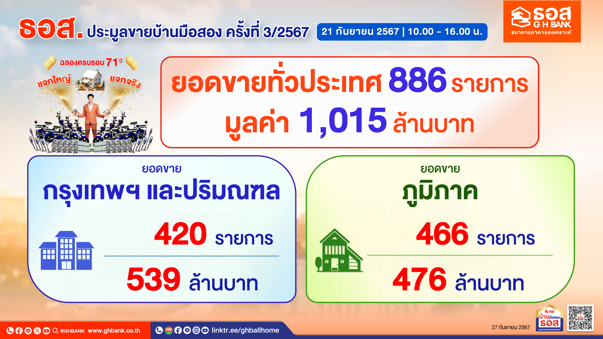 ธนาคารอาคารสงเคราะห์ (ธอส.) ฉลองวันคล้ายวันสถาปนาธนาคารอาคารสงเคราะห์ครบรอบ 71 ปี ในการเป็นสถาบันการเงินของรัฐ ที่มีบทบาทสำคัญในการดำเนินการตามนโยบายรัฐบาลและกระทรวงการคลังในการสนับสนุนคนไทยได้มีที่อยู่อาศัยเป็นของตนเองมาแล้วมากกว่า 4.4 ล้านครอบครัว ล่าสุด ณ วันที่ 19 กันยายน 2567 สามารถปล่อยสินเชื่
