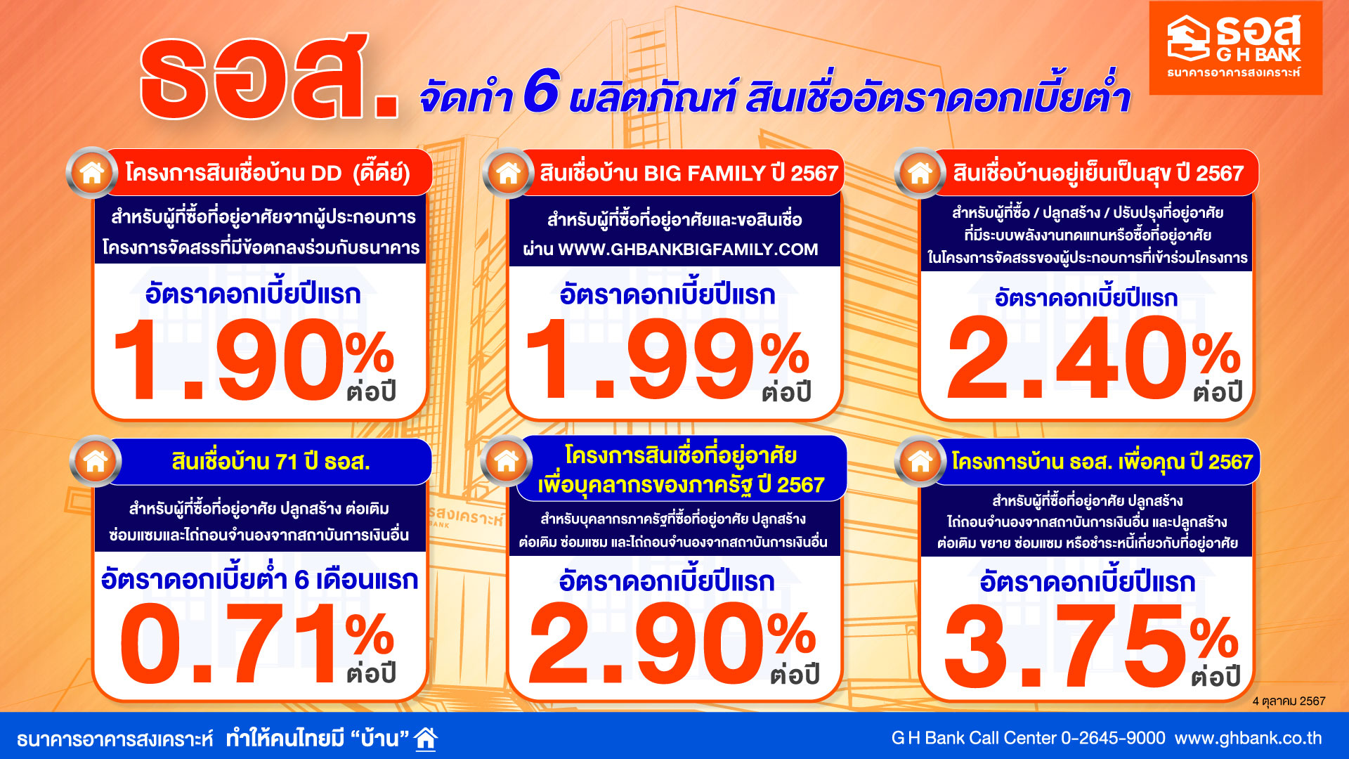 • โครงการบ้าน ธอส. เพื่อคุณ ปี 2567 สำหรับผู้ที่ต้องการซื้อบ้าน ห้องชุด (คอนโดมิเนียม) ปลูกสร้าง ไถ่ถอนจำนองจากสถาบันการเงินอื่น และปลูกสร้าง ต่อเติม ขยาย ซ่อมแซม หรือชำระหนี้เกี่ยวกับที่อยู่อาศัยพร้อมกับการขอกู้ในวัตถุประสงค์ไถ่ถอนจำนอง วงเงินให้กู้สูงสุดไม่เกิน 3 ล้านบาทต่อรายต่อหลักประกัน อัตราดอกเบี้ยปีแรก เท่ากับ 3.75% ต่อปี ปีที่ 2 เท่ากับ 4.35% ต่อปี ปีที่ 3 – 5 เท่ากับ 4.85% ต่อปี ปีที่ 6 – 9 เท่ากับ MRR-70% ต่อปี และปีที่ 10 จนถึงตลอดอายุสัญญา กรณีลูกค้าสวัสดิการ เท่ากับ MRR-1.50% ต่อปี กรณีลูกค้ารายย่อย เท่ากับ MRR-0.75% ต่อปี และกรณีชำระหนี้ เท่ากับ MRR