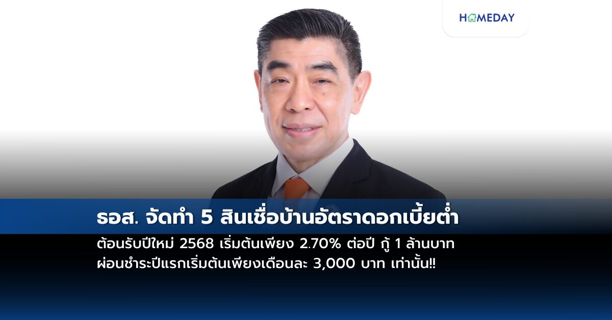 ธนาคารอาคารสงเคราะห์ (ธอส.) สถาบันการเงินของรัฐ ที่พร้อมสนับสนุนให้คนไทยมีบ้านอย่างมั่นคงและยั่งยืน จัดทำ 5 สินเชื่อที่อยู่อาศัยอัตราดอกเบี้ยต่ำ (สำหรับลูกค้าที่มีความประสงค์ทำประกันชีวิตคุ้มครองสินเชื่อ (MRTA/MLTA)) ประกอบด้วย 1. สินเชื่อบ้าน Life Begins with GHB ปี 2568 : สำหรับสมาชิกสภา / สมาคมวิชาชีพที่ต้องการกู้เพื่อซื้อ ปลูกสร้าง รีไฟแนนซ์ อัตราดอกเบี้ยปีแรกเพียง 1.79% ต่อปี เฉลี่ย 3 ปีแรก เท่ากับ 2.70% กู้ 1 ล้านบาท ผ่อนชำระเงินงวดปีแรกเริ่มต้นเพียงเดือนละ 3,000 บาท เท่านั้น!, 2. สินเชื่อบ้าน GHB Precious ปี 2568 : สำหรับผู้ที่มีรายได้ตั้งแต่ 70,000 บาทต่อเดือนขึ้นไป อัตราดอกเบี้ยปีแรกเพียง 1.79% ต่อปี เฉลี่ย 3 ปีแรก เท่ากับ 2.70% กู้ 1 ล้านบาท ผ่อนชำระเงินงวดปีแรกเริ่มต้นเพียงเดือนละ 3,000 บาท, 3. สินเชื่อบ้านอยู่เย็นเป็นสุข ปี 2568 : สำหรับผู้ที่ต้องการซื้อ ปลูกสร้าง และปรับปรุงที่อยู่อาศัยที่ช่วยประหยัดพลังงาน อัตราดอกเบี้ยปีแรกเพียง 2.20% ต่อปี เฉลี่ย 3 ปีแรก เท่ากับ 2.90% กู้ 1 ล้านบาท ผ่อนชำระเงินงวดปีแรกเริ่มต้นเพียงเดือนละ 3,200 บาท, 4. สินเชื่อบ้านสวัสดิการ ปี 2568 : สำหรับผู้ที่เป็นลูกค้าสวัสดิการกับหน่วยงานที่ทำข้อตกลงโครงการสวัสดิการเงินกู้ที่อยู่อาศัยประเภทไม่มีเงินฝาก อัตราดอกเบี้ยปีแรกเพียง 2.30% ต่อปี เฉลี่ย 3 ปีแรก เท่ากับ 2.90% กู้ 1 ล้านบาท ผ่อนชำระเงินงวดปีแรกเริ่มต้นเพียงเดือนละ 3,200 บาท และ 5. สินเชื่อเพื่อที่อยู่อาศัย ปี 2568 : สำหรับผู้ที่ต้องการกู้เพื่อซื้อ ปลูกสร้าง ต่อเติม หรือซ่อมแซม อัตราดอกเบี้ยปีแรกเพียง 2.50% ต่อปี เฉลี่ย 3 ปีแรก เท่ากับ 3.20% กู้ 1 ล้านบาท ผ่อนชำระเงินงวดปีแรกเริ่มต้นเพียงเดือนละ 3,300 บาท ผู้ที่สนใจสามารถยื่นขอสินเชื่อได้แล้ว ณ สาขาธนาคารทั่วประเทศ ตั้งแต่วันนี้ถึงวันที่ 31 มีนาคม 2568 อนุมัติและทำนิติกรรมภายในวันที่ 30 เมษายน 2568