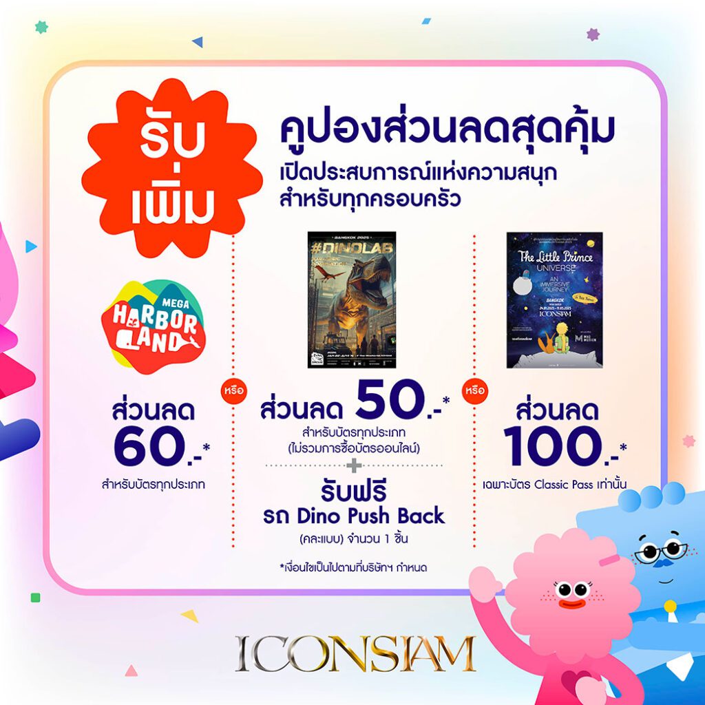 • ส่วนลด 60 บาท สำหรับบัตรเข้า “Mega HarborLand” สำหรับการซื้อบัตรแบบ 1 Pass เข้าเล่นโซน HarborLand หรือ JumpZ หรือ Inflatable (จำกัด 500 สิทธิ์ ตลอดรายการ)
