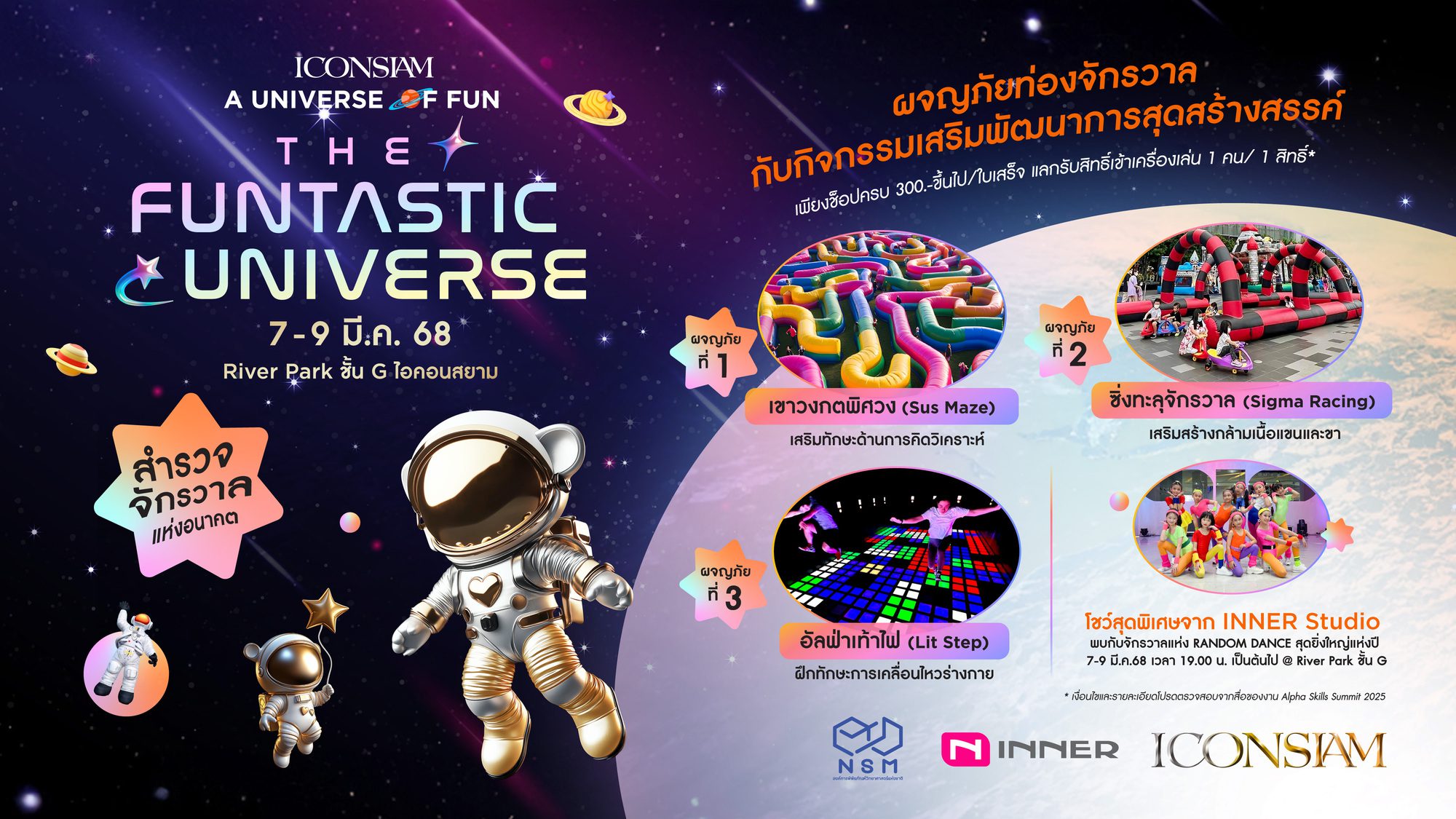 อีกหนึ่งงานใหญ่เอาใจเด็ก ๆ ที่จัดขึ้นในช่วงเวลาเดียวกันคือ “ICONSIAM A Universe of Fun : The Funtastic Universe” ที่เนรมิตพื้นที่ ริเวอร์ พาร์ค ชั้น G ไอคอนสยาม ให้เป็นจักรวาลแห่งอนาคตที่จะเสริมประสบการณ์ให้เจ้าตัวเล็กของทุกครอบครัวได้เล่นสนุกควบคู่กับการเรียนรู้เรื่องดวงดาวและอวกาศ ผ่านการผจญภัยในจักรวาลสุดสร้างสรรค์ โดยมีกิจกรรมเสริมทักษะด้านต่าง ๆ อาทิ “SUS MAZE เขาวงกตพิศวง” เกมเขาวงกตที่จะช่วยพัฒนาด้านการคิดวิเคราะห์และการแก้ปัญหา สร้างทักษะการคิดเชิงตรรกะให้เด็กคิดอย่างมีระเบียบและใช้เหตุผลในการตัดสินใจ “SIGMA RACING ซิ่งทะลุจักรวาล” กิจกรรมรถแข่งเสริมสร้างพัฒนาการทั้งด้านร่างกายและจิตใจ ช่วยให้เด็กได้ฝึกทักษะที่สำคัญสำหรับการเติบโต อีกทั้งยังเป็นการฝึกการประสานงานระหว่างกล้ามเนื้อที่ช่วยเสริมสร้างกล้ามเนื้อขาและแขนได้ดี “Lit Step อัลฟ่าเท้าไฟ” กิจกรรมฝึกทักษะการประสานร่างกาย (Body Coordination) ที่จะช่วยพัฒนาความสามารถในการประสานงานระหว่างตาและส่วนต่าง ๆ ของร่างกาย ในการเคลื่อนไหวพร้อมกัน
