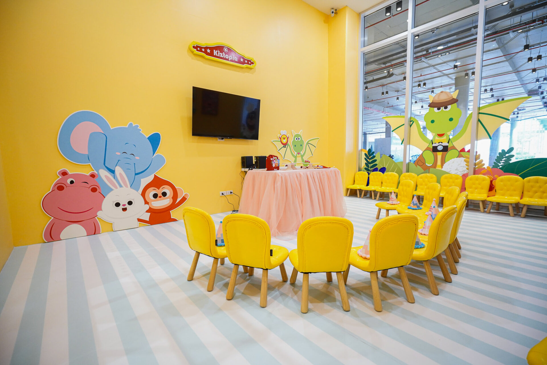 สวรรค์แห่งความบันเทิงเพื่อคุณหนู ๆ แห่งนี้มีคาแรคเตอร์หลักเป็นสัตว์ทั้งหมด 8 ชนิด ที่ได้รับการจดทะเบียนเป็นทรัพย์สินทางปัญญา (IP) ของแบรนด์คิซโทเปีย โดยตัวละครทั้ง 8 จะคอยสร้างสีสันและเป็นแรงบันดาลใจให้กับเด็ก ๆ ไม่ว่าจะเป็น เชฟหมี Bell, Tiger นักกีฬาจอมพลัง, Happy ฮิปโปสาวนักเต้น, Eli วิศวกรช้างมือหนึ่ง, คุณครูกระต่ายสาว Raby, Mark เจ้าจ๋อนักวิทยาศาสตร์, Honey ผึ้งน้อยเสียงหวาน และ Drago พี่มังกรนักข่าวแสนฉลาด