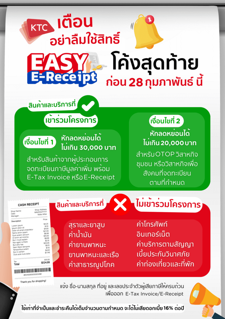 โครงการอีซี่ อี – รีซีท (Easy E-Receipt) ได้เริ่มมาตั้งแต่วันที่ 16 มกราคม 2568 ขณะนี้เหลือเวลาอีกเพียงไม่กี่วันที่ทุกคนจะได้ใช้สิทธิ์ลดหย่อนภาษีก่อนสิ้นสุดมาตรการในวันที่ 28 กุมภาพันธ์ 2568 เคทีซี หรือ บริษัท บัตรกรุงไทย จำกัด (มหาชน) ชวนสมาชิกมาทบทวนอีกครั้งหากต้องการใช้สิทธิ์อีซี่ อี – รีซีท (Easy E-Receipt)