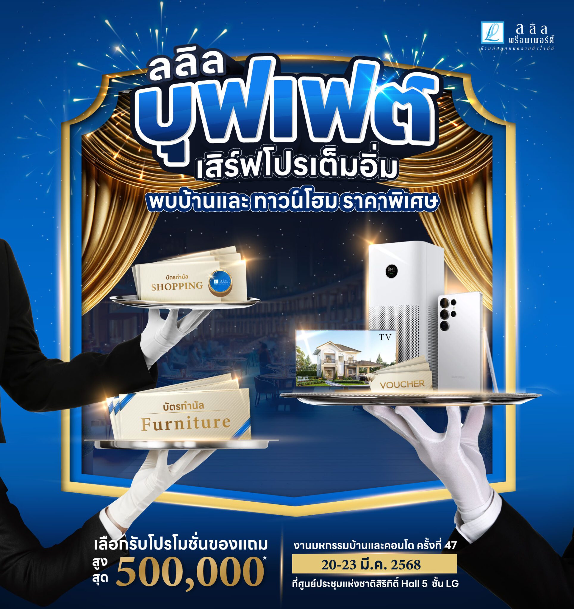 20-23 มีนาคม นี้ ลลิล พร็อพเพอร์ตี้ ร่วมงานมหกรรมบ้านและคอนโด ครั้งที่ 47 ที่จัดขึ้นที่ศูนย์ประชุมแห่งชาติสิริกิติ์ Hall 5 ชั้น LG โดยได้นำเหล่าที่อยู่อาศัยคุณภาพจากหลากหลายโครงการในเครือมาให้เลือกกันแบบจุใจ และมอบข้อเสนอพิเศษภายในงานให้ลูกค้าสามารถเลือกโปรโมชันของแถมได้ตามต้องการ รวมมูลค่าสูงสุดถึง 500,000 บาท