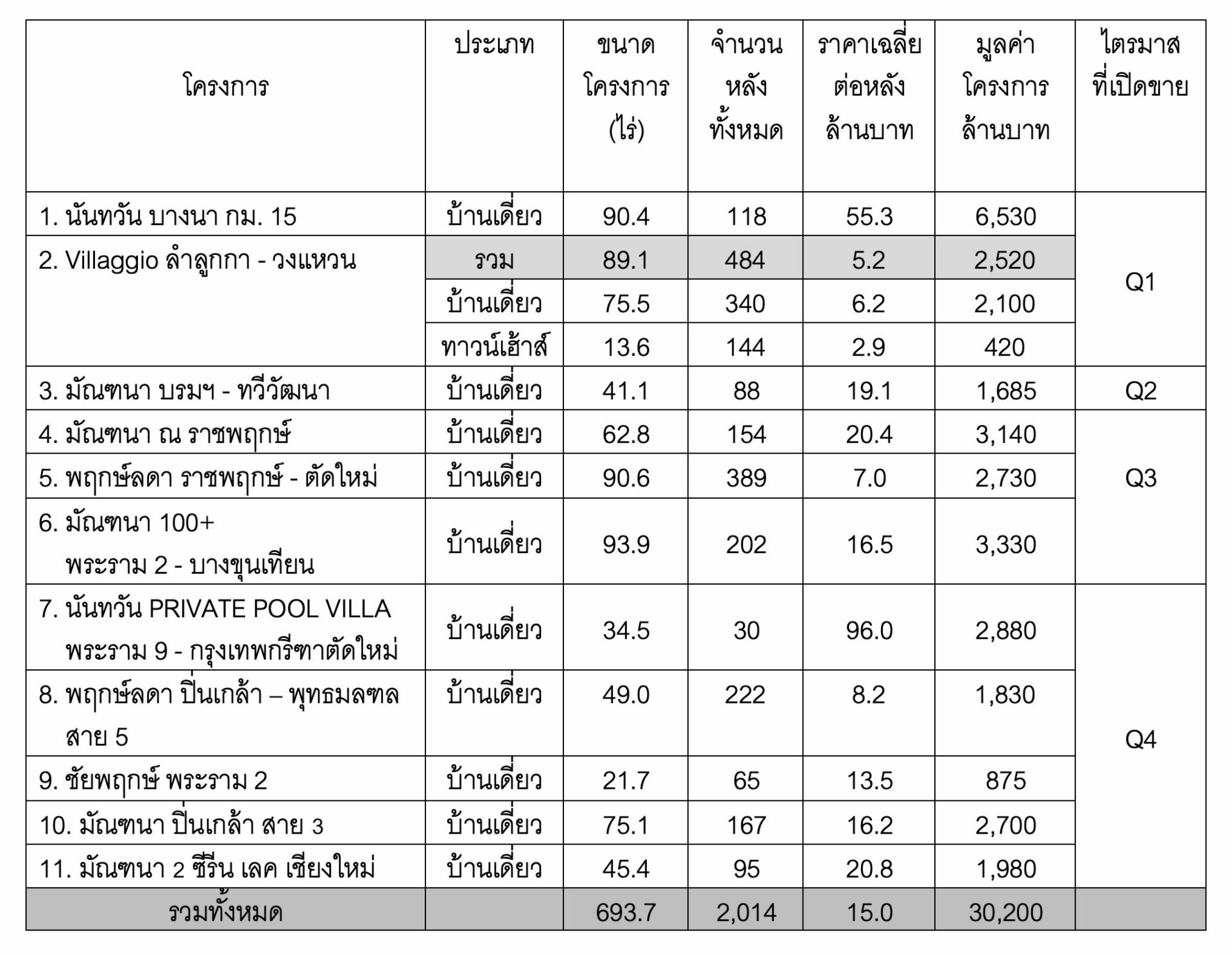 • บริษัทฯ เปิดโครงการใหม่ 17 โครงการ มูลค่าโครงการรวม 43,460 ล้านบาท โดยเป็นสินค้าแนวราบ 16 โครงการ และสินค้าคอนโดมิเนียม 1 โครงการ เพิ่มขึ้น 8,500 ล้านบาทเมื่อเทียบกับมูลค่าโครงการตามแผนเดิม 34,960 ล้านบาท เนื่องจากมีการเปิดโครงการวันเวลา ณ เจ้าพระยา มูลค่า 15,000 ล้านบาท แทนโครงการ The Key ศรีนครินทร์ ซึ่งมีมูลค่า 6,500 ล้านบาท