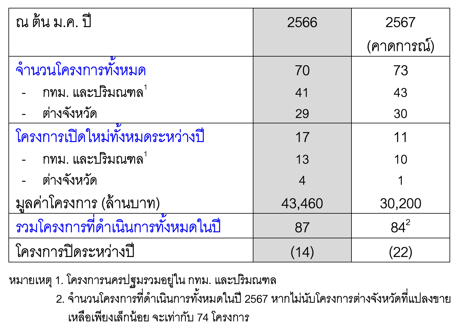 • ทำให้ ณ สิ้นปี 2566 มีโครงการที่ยกไปดำเนินการต่อในปี 2567 เป็นจำนวน 73 โครงการ รวมมูลค่ากว่า 68,350 ล้านบาท เป็นโครงการแนวราบ 66 โครงการ มูลค่า 52,350 ล้านบาท และคอนโดมิเนียม 7 โครงการ มูลค่า 16,000 ล้านบาท