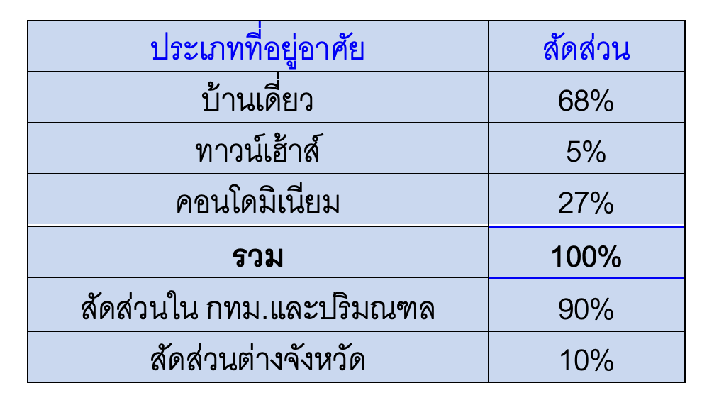 • เมื่อแยกรายตลาด พบว่า ตลาดบ้านแนวราบเพิ่มขึ้น ในขณะที่ตลาดคอนโดมิเนียมลดลง โดยที่ตลาดบ้านเดี่ยวและบ้านแฝดเพิ่มขึ้น 58% ทาวน์เฮ้าส์เพิ่มขึ้น 12% และคอนโดมิเนียมลดลง 48%