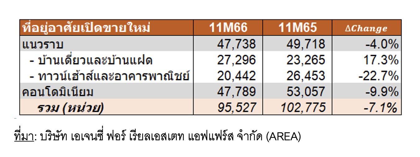 • ในด้านอุปทาน จำนวนหน่วยที่อยู่อาศัยเปิดขายใหม่ในกทม.และปริมณฑล ช่วงเดือน ม.ค. – พ.ย. 2566 โดยรวมทั้งตลาดมีจำนวน 95,527 หน่วย ลดลง 7.1% เมื่อเทียบกับช่วงเวลาเดียวกันของปีก่อน อุปทานที่ลดลงมาจากตลาดทาวน์เฮ้าส์ และคอนโดมิเนียมที่ลดลง 23% และ 10% ตามลำดับ ส่วนตลาดบ้านเดี่ยวและบ้านแฝดมีการเปิดขายใหม่เพิ่มขึ้น 17.3% ส่งผลให้สินค้าบ้านเดี่ยวซึ่งเป็นสินค้าหลักของบริษัท มีสภาวะการแข่งขันที่สูงขึ้น จากอุปทานที่เพิ่มขึ้นต่อเนื่องมาจากปี 2565