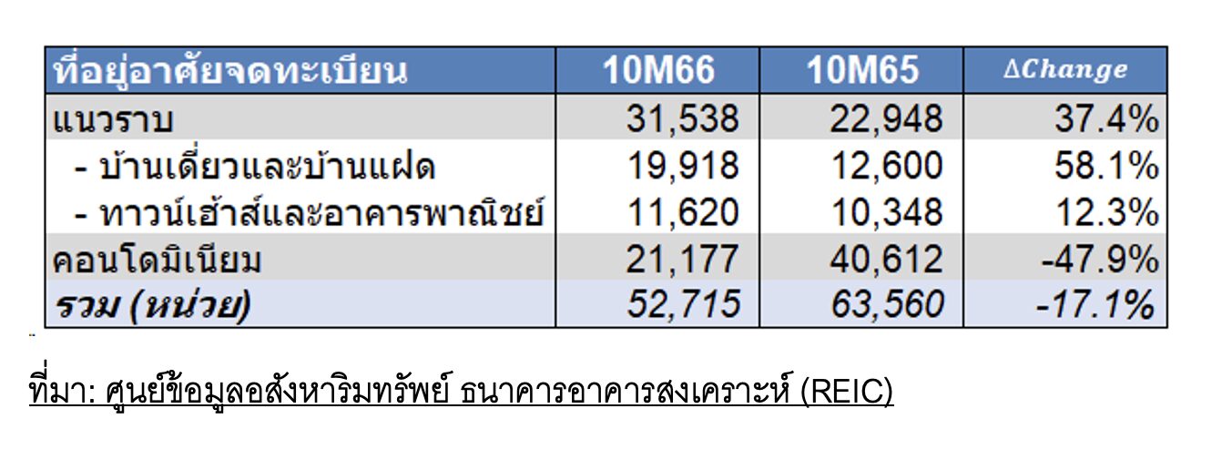 • ปี 2566 จำนวนที่อยู่อาศัยสร้างเสร็จและจดทะเบียนโดยผู้ประกอบการในกทม.และปริมณฑล โดยรวมทั้งตลาด ช่วงเดือน ม.ค. – ต.ค. 2566 มีจำนวน 52,715 หน่วย ลดลง 17.1% เมื่อเทียบกับช่วงเดียวกันของปีก่อน