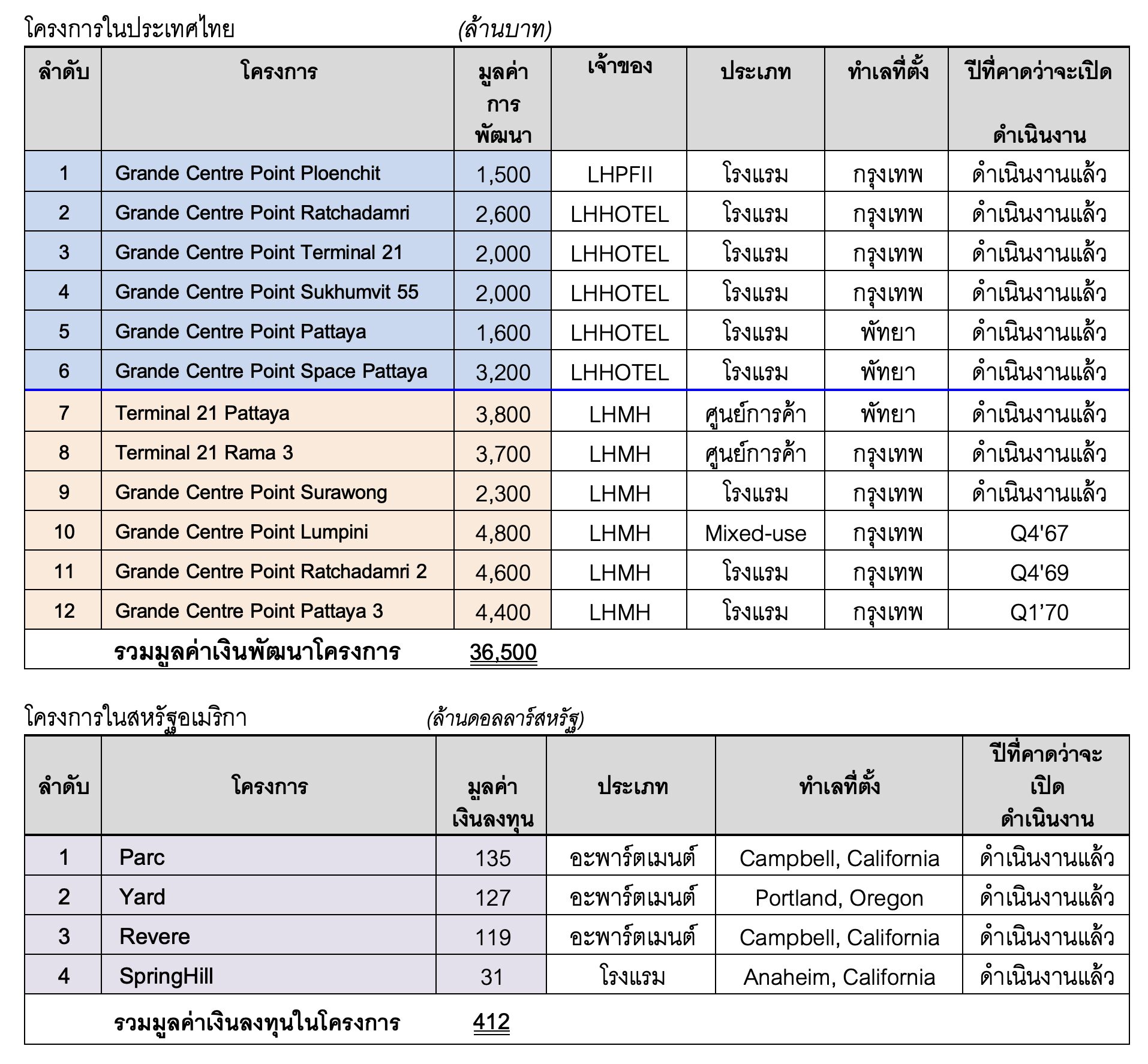 • ปัจจุบัน บริษัทฯ มีโครงการซึ่งก่อให้เกิดรายได้ค่าเช่า ทั้งที่ดำเนินการแล้วและอยู่ระหว่างพัฒนาทั้งหมด 16 โครงการ ดำเนินการโดยบริษัท LHMH 12 โครงการ และบริษัท LH USA 4 โครงการ