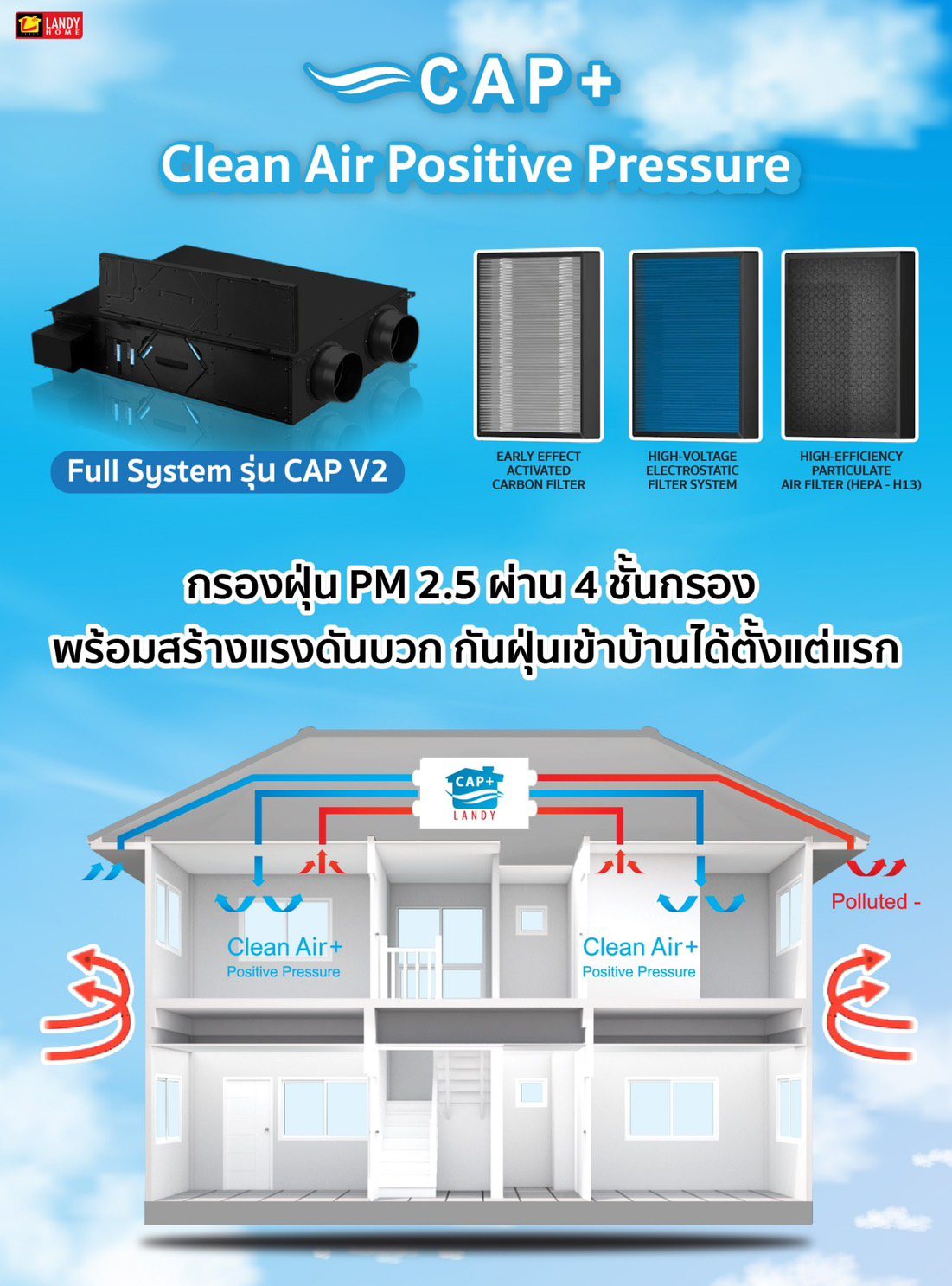 แลนดี้ โฮม ผู้นำธุรกิจรับสร้างบ้านรายแรกและรายเดียวในสมาคมธุรกิจรับสร้างบ้าน ที่ติดตั้ง CAP+ (Clean Air Positive Pressure) ระบบแรงดันบวก ป้องกันฝุ่น PM 2.5 เพื่อให้บ้านปลอดฝุ่นตั้งแต่ต้นทาง พร้อมเติม Fresh Air ให้อากาศหมุนเวียนอย่างสะอาดโดยไม่ต้องเปิดหน้าต่าง ลดฝุ่น ลดเชื้อโรค และลดปัญหาภูมิแพ้ นับเป็นมาตรฐานใหม่ที่ทุกบ้านต้องมีในยุคปัจจุบัน