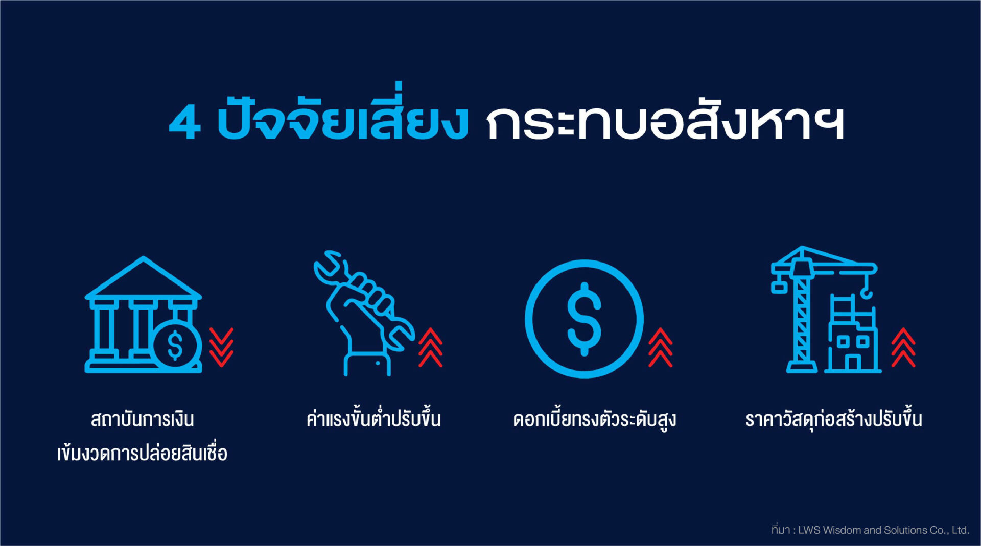 จากปัจจัยเสี่ยงทางธุรกิจดังกล่าว นายประพันธ์ศักดิ์ กล่าวว่า LWS แนะนำให้แนะผู้ประกอบการอสังหาฯ ปรับกลยุทธการขายจากผู้พัฒนาและขายที่อยู่อาศัย สู่การเป็นที่ปรึกษาทางการเงินเพื่อการมีที่อยู่อาศัยทั้งเพื่อการอยู่อาศัยและการลงทุน โดยเพิ่มการให้คำแนะนำในการบริหารจัดการทางการเงินให้กับลูกค้าเพื่อให้โครงสร้างทางการเงินส่วนบุคคลได้รับการยอมรับและการพิจารณาสินเชื่อจากสถาบันการเงิน เนื่องจากกลุ่มลูกค้าที่มักจะถูกปฏิเสธสินเชื่อจากสถาบันการเงินเป็นกลุ่มลูกค้าที่มีอาชีพอิสระ ทำให้มีฐานรายได้ไม่แน่นอน ถ้าบริษัทอสังหาริมทรัพย์สามารถจับมือกับสถาบันการเงินและให้คำแนะนำกับลูกค้าในการบริหารจัดการทางการเงินก็จะลดความเสี่ยงในการถูกปฏิเสธสินเชื่อจากสถาบันการเงิน