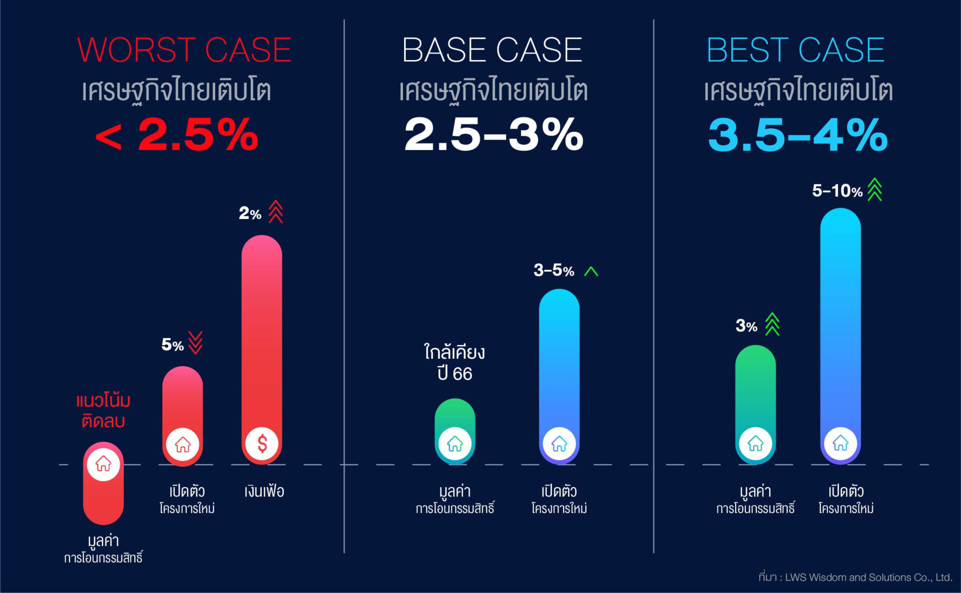 โดยการคาดการณ์ดังกล่าว LWS ได้มีการวิเคราะห์ความเป็นไปได้ในการเติบโตของเศรษฐกิจและอสังหาริมทรัพย์ใน 3 ฉากทัศน์ (3-Scenarios) กล่าวคือ