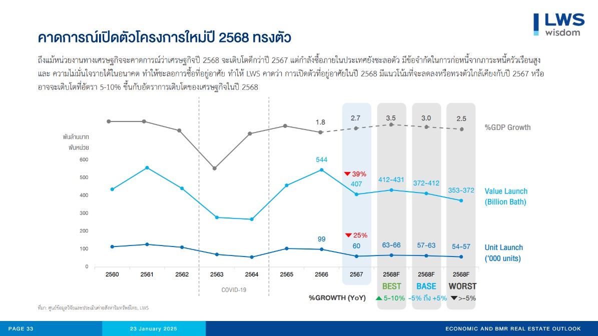 นายประพันธ์ศักดิ์ รักษ์ไชยวรรณ กรรมการผู้จัดการ บริษัท แอล ดับเบิลยู เอส วิสดอม แอนด์ โซลูชั่นส์ จำกัด บริษัท วิจัยและพัฒนาอสังหาริมทรัพย์ ในเครือ บริษัท แอล.พี.เอ็น. ดีเวลลอปเมนท์ จำกัด (มหาชน) กล่าวถึงแนวโน้มการเปิดตัวที่อยู่อาศัยใหม่ในพื้นที่กรุงเทพฯ-ปริมณฑลในปี 2568 ว่ามีแนวโน้มที่จะชะลอตัวลงเมื่อเทียบกับปี 2567 โดย แอล ดับเบิลยู เอสฯ ได้คาดการณ์ความเป็นไปได้ในการเปิดตัวโครงการใหม่ใน 3 ฉากทัศน์ โดยคำนึงถึงอัตราการเติบโตทางเศรษฐกิจ และ กำลังซื้อ กล่าวคือ