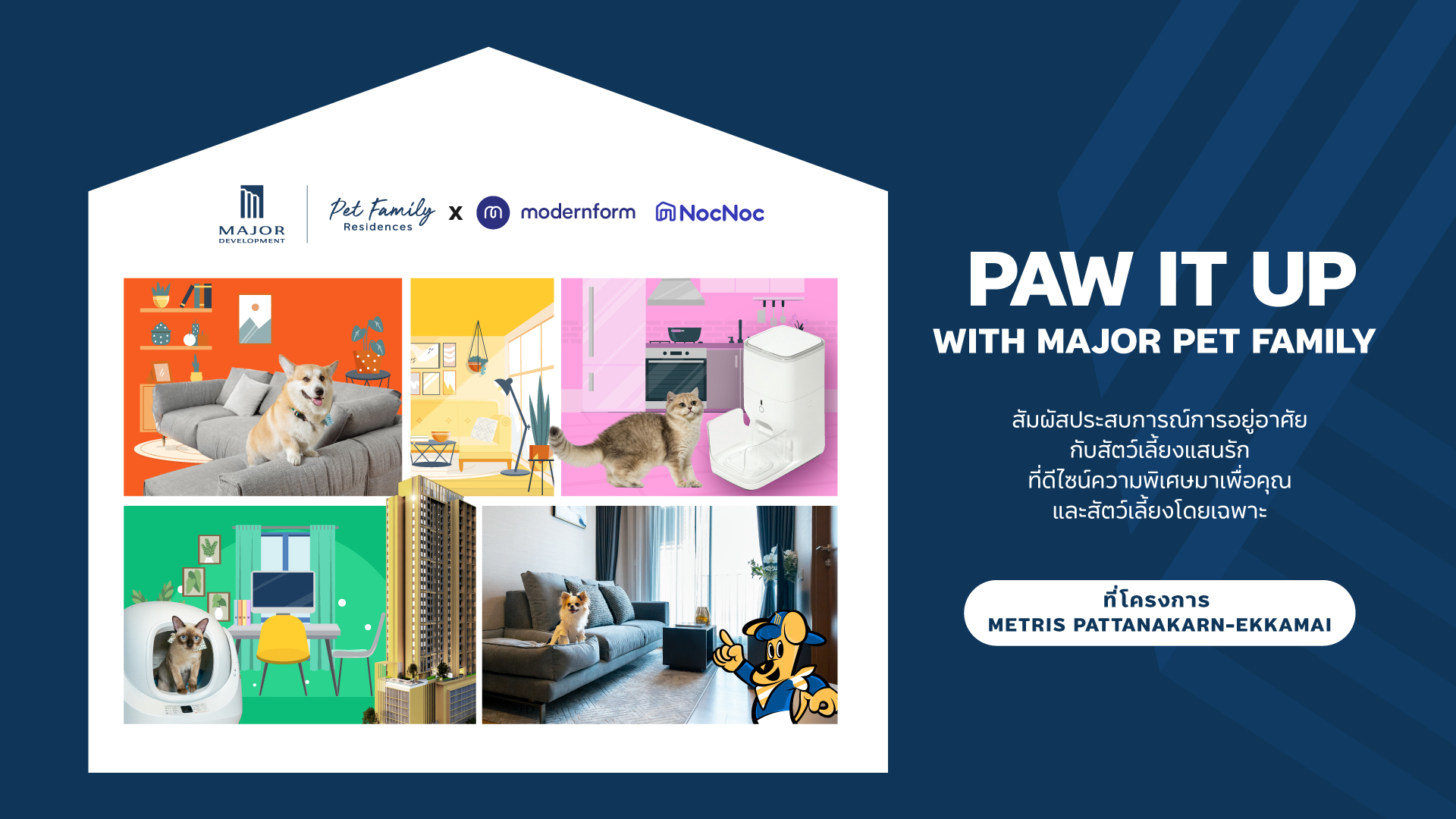 ) บริษัท เมเจอร์ ดีเวลลอปเม้นท์ จำกัด (มหาชน) ผู้นำด้านการพัฒนาธุรกิจอสังหาริมทรัพย์ระดับลักชูรีและคอนโดมิเนียมเลี้ยงสัตว์ได้ (Pet Family Residences) ผนึกความร่วมมือ 2 พาร์ทเนอร์สุดแกร่ง อย่าง โมเดอร์นฟอร์ม ผู้นำธุรกิจเฟอร์นิเจอร์ที่เข้าใจไลฟ์สไตล์คนยุคใหม่ และ NocNoc ศูนย์รวมสินค้าและบริการเรื่องบ้านออนไลน์ ตอกย้ำการยกระดับคุณภาพชีวิตและมอบความสุขอย่างเท่าเทียมให้กับผู้อยู่อาศัย ภายใต้จุดยืน ‘Pet Family Residences’ ที่ไม่ใช่แค่เทรนด์ แต่คือ ความตั้งใจ พร้อมมอบโปรโมชันชุดใหญ่ที่เอ็กซ์คลูซีฟเฉพาะลูกบ้านของเมเจอร์ ดีเวลลอปเม้นท์