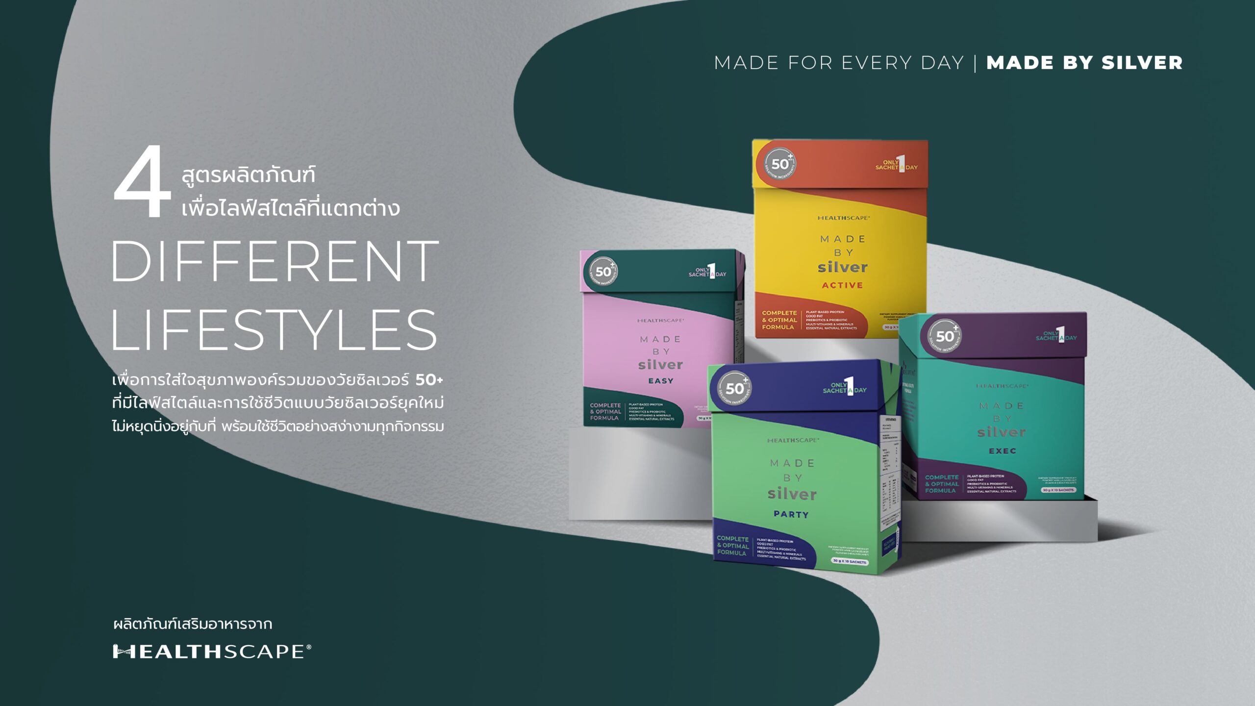 เภสัชกรศรายุทธ ทัฬหิกรณ์ Business Unit Director บริษัท เฮลท์สเคป (HealthScape) จำกัด กล่าวว่า “ภายใต้การบริหารธุรกิจ Well-being ของบริษัทฯ เราได้เตรียมแนะนำผลิตภัณฑ์เสริมอาหารที่ช่วยตอบโจทย์ความต้องการด้านสุขภาพในแบบองค์รวม (Holistic Health) และเติมเต็มความต้องการของร่างกายที่แตกต่างกันไปเพื่อความสมบูรณ์สูงสุด (Optimum Health) ตามแนวทางศาสตร์ชะลอวัย โดยนำเสนอนวัตกรรมสุขภาพแบรนด์แรก “MADE BY SILVER (เมด บาย ซิลเวอร์)” โดยเจาะกลุ่มเป้าหมายคนที่มีอายุ 50 ปีขึ้นไป มาพร้อมนวัตกรรมที่เป็นเอกสิทธิ์โดยเฉพาะของเฮล์ทสเคป ที่เรียกว่า “BIOSCAPE® (ไบโอสเคป)” ซึ่งผสมผสานกลุ่มสารอาหารสำคัญในปริมาณที่เหมาะสม สามารถเสริมฤทธิ์ได้เต็มประสิทธิภาพสูงสุด และเต็มเปี่ยมไปด้วยคุณประโยชน์จำเป็นต่อร่างกาย อาทิ โปรตีนพืช (Pea, Almond) ไขมันดี (MCT Oil, Flaxseed Oil) ไฟเบอร์ วิตามิน 13 ชนิด เกลือแร่ 8 ชนิด พรีไบโอติกส์ โพรไบโอติก และกรดอะมิโนชนิด BCAA และสารสกัดจากธรรมชาติอีกหลากชนิด ทั้งตามความต้องการพื้นฐาน และเติมเต็มตามไลฟ์สไตล์ที่แตกต่างกัน เพื่อให้ร่างกายได้รับสารอาหารที่ครบถ้วน ตอบโจทย์องค์ประกอบในด้าน Good Nutrition, Good Digestion, Good Sleep ซึ่งถือเป็นรากฐานสำคัญของสุขภาพที่แข็งแรง”