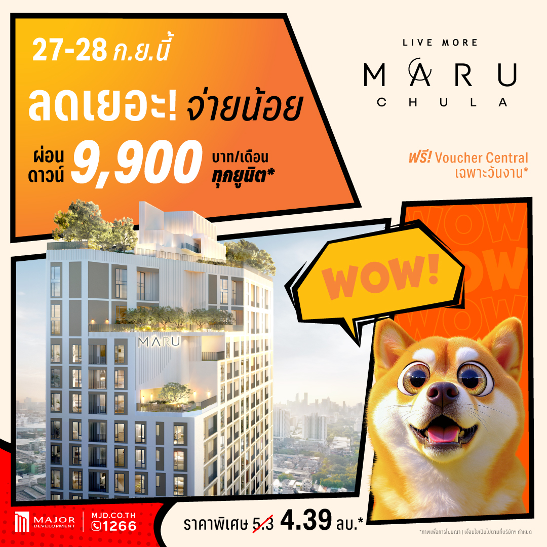 “MARU CHULA” เปิดชมห้องตัวอย่าง และสำนักงานขาย เป็นครั้งแรก 1-2 ก.พ.นี้ มอบส่วนลดสูงสุด 5 แสนบาท มั่นใจยอดจองในงานไม่ต่ำกว่า 60% โครงการ MARU CHULA โดย บมจ.เมเจอร์ ดีเวลลอปเมนท์ เตรียมจัดงาน Open Sales Gallery 1-2 ก.พ.นี้ เปิดชมห้องตัวอย่าง-สำนักงานครั้งแรก ตั้งเป้ายอดจองกว่า 60