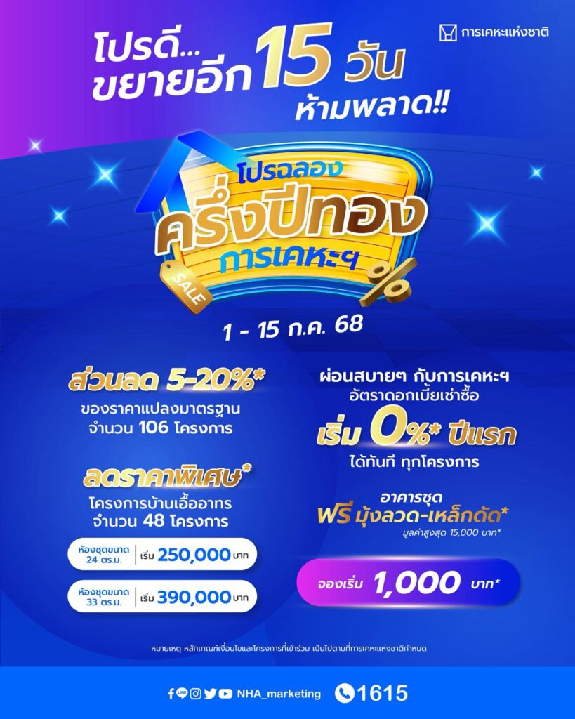 การเคหะแห่งชาติ (กคช.) เดินหน้าสานต่อภารกิจเปิดโอกาสให้ประชาชนเข้าถึงที่อยู่อาศัยคุณภาพในราคาจับต้องได้ ล่าสุดประกาศขยายระยะเวลาแคมเปญใหญ่แห่งปี “ฉลองครึ่งปีทอง กับการเคหะแห่งชาติ” ออกจนถึงวันที่ 15 กรกฎาคม 2568