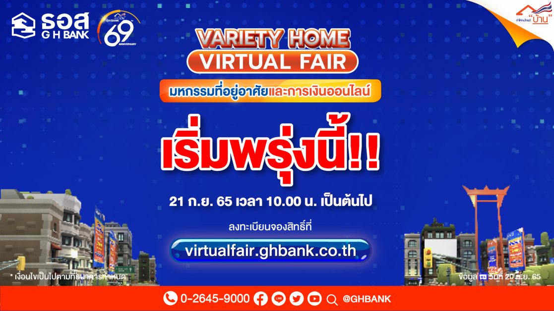ธนาคารอาคารสงเคราะห์ (ธอส.) ฉลองครบรอบการดำเนินงาน 69 ปี จัดงาน Variety Home Virtual Fair : มหกรรมที่อยู่อาศัยและการเงินออนไลน์จาก ธอส. ครั้งที่ 2 เริ่มเปิดให้ลูกค้าประชาชนลงทะเบียนเข้าร่วมงานทางเว็บไซต์ virtualfair.ghbank.co.th ตั้งแต่วันพุธที่ 21 กันยายน 2565 เวลา 10.00 น. เป็นต้นไป พบกับโปรโมชั่นพิเศษที่มีเฉพาะในงานนี้ที่เดียวเท่านั้น สินเชื่อบ้านอัตราดอกเบี้ยพิเศษ ต่อที่ 1 ปีที่ 1 เท่ากับ MRR-4.46% (ปัจจุบันเท่ากับ 1.69%) ต่อปี อัตราดอกเบี้ยเฉลี่ย 3 ปีแรกเพียง 2.35% ให้กู้สำหรับซื้อที่อยู่อาศัยในราคาซื้อ-ขายไม่เกิน 3 ล้านบาท และยังมีสินเชื่ออัตราดอกเบี้ยต่ำแบบสุด ๆ ในช่วง Golden Minute เงินฝากออมทรัพย์อัตราดอกเบี้ยสูง 2.00% ต่อปี พร้อมช่วง Golden Minute รับอัตราดอกเบี้ยพิเศษเฉพาะในงานนี้ บ้านมือสอง ธอส. ราคาไม่เกิน 3 ล้านบาท มากกว่า 4,000 รายการทั่วประเทศ ให้ส่วนลดสูงสุดถึง 50% และบ้านมือหนึ่ง ราคาขายไม่เกิน 3 ล้านบาท จากผู้ประกอบการอสังหาริมทรัพย์ทั่วประเทศกว่า 100 โครงการ พร้อมด้วยส่วนลดและของแถมมากมาย ทั้งนี้ สินเชื่อและเงินฝากในงานมีจำนวนจำกัด จองก่อนได้ก่อนหมดแล้วหมดเลย!! โดยงาน Variety Home Virtual Fair : มหกรรมที่อยู่อาศัยและการเงินออนไลน์จาก ธอส. ครั้งที่ 2 จะจัดขึ้นระหว่างวันที่ 21-25 กันยายน 2565