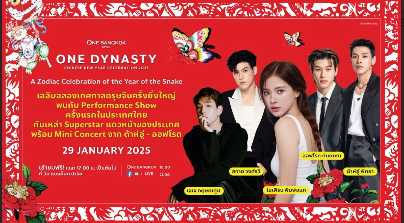พลาดไม่ได้กับไฮไลท์สุดพิเศษในวันพุธที่ 29 มกราคม 2568 เวลา 19.00 น. กับการแสดงสุดอลังการ “เดอะ เซเลเบรชัน ออฟ วัน ไดนาสตี้” (The Celebration of ONE DYNASTY) ในรูปแบบ Performance Show ที่ไม่เคยมีที่ใดจัดแสดงมาก่อน โดยได้รับแรงบันดาลใจจากตำนาน “สี่สัตว์เทวะ” หรือ “ซื่อเซี่ยง” อันได้แก่ นกฟินิกส์ สิงโตขาว เต่าดำ และมังกรคราม สัญลักษณ์แห่งความโชคดีและความรุ่งเรืองตามความเชื่อของชาวจีน บนเวทีพร้อมจอ LED ขนาดใหญ่ เทคนิคแสง สี เสียง สุดล้ำเหนือจินตนาการ พร้อมเหล่านักแสดงกว่า 150 ชีวิต พร้อมด้วยทัพศิลปินดาราชั้นนำที่จะมาร่วมสร้างสีสัน นำโดย ใบเฟิร์น-พิมพ์ชนก ลือวิเศษไพบูลย์ ในบทบาท “เจ้าหญิง ลูน่า เทพราชินีแห่งพระจันทร์” (Princess Luna), ออฟโรด-กันตภณ จินดาทวีผล ในบทบาท “เทพแห่งนกฟินิกส์”, ต้าห์อู๋-พิทยา แซ่ฉั่ว ในบทบาท “เทพสิงโตขาว”, สกาย-วงศ์รวี นทีธร ในบทบาท “เทพเต่าดำ” และ เจเจ-กฤษณภูมิ พิบูลสงคราม ในบทบาท “พญามังกรคราม” โดยการแสดงและคอสตูมทั้งหมดของนักแสดงได้รับการออกแบบอย่างประณีตโดย ผักกาด – ประภากาศ อังศุสิงห์ ดีไซเนอร์ชื่อดังของไทย ปิดท้ายความยิ่งใหญ่ด้วยมินิคอนเสิร์ตจาก ต้าห์อู๋-พิทยา และออฟโรด-กันตภณ