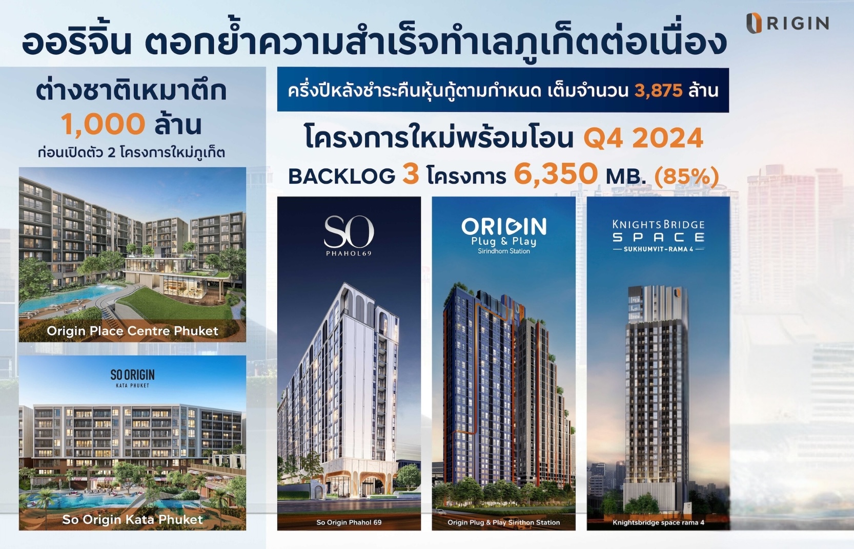 ออริจิ้น พร็อพเพอร์ตี้ ครึ่งปีหลังยังแกร่ง กวาดยอดขายใหม่จากต่างชาติในภูเก็ต 1,000 ล้านตั้งแต่ยังไม่เปิดขายทางการ เตรียมลุยเปิดโครงการใหม่ตอกย้ำความสำเร็จทำเลภูเก็ตต่อเนื่อง และชำระคืนหุ้นกู้ครบกำหนดช่วงครึ่งปีหลัง 2567 จำนวน 5 รุ่นเต็มจำนวน 3,875 ล้านบาทตามกำหนด 100% ตอกย้ำประวัติชำระคืนพร้อมดอกเบี้ยครบตามกำหนด 8 ปีต่อเนื่อง