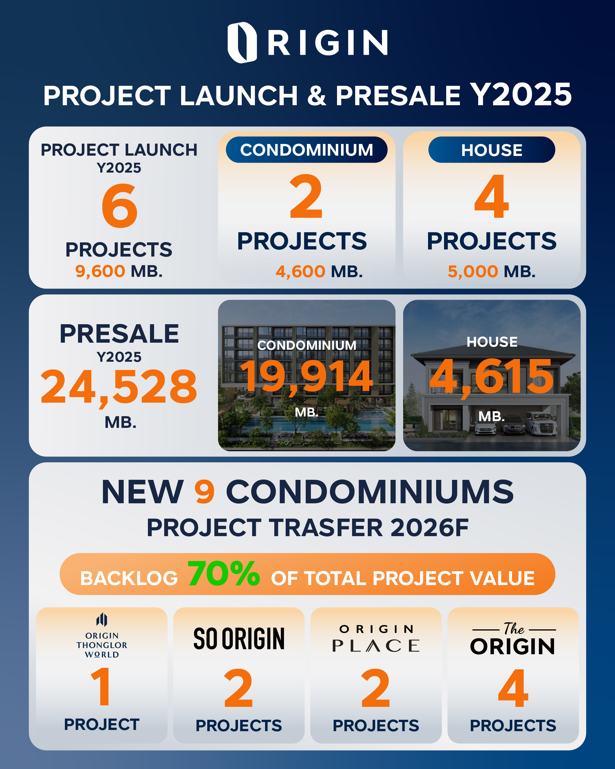 ออริจิ้น พร็อพเพอร์ตี้ เผยยอดขายบ้านและคอนโดฯ ปี 2568 รวมกว่า 24,500 ล้านบาท ทั้งจากโครงการพร้อมอยู่ โครงการเปิดใหม่ และโครงการระหว่าง Ongoing บนทำเลศักยภาพทั้งในกรุงเทพฯและต่างจังหวัด ปี 2569 จ่อโอนคอนโดฯ เพิ่มอีก 9 โครงการ ตุน Backlog แล้วกว่า 70% ของมูลค่าโครงการ