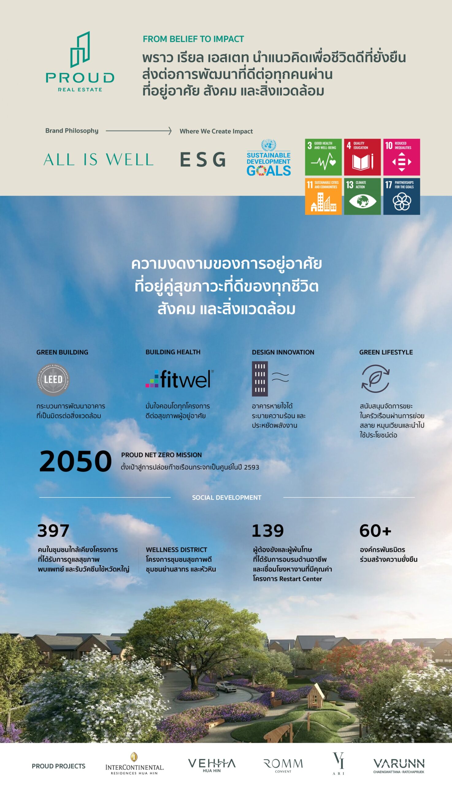 PROUD สร้างผลงานโตก้าวกระโดดติด Top10 อสังหาฯ ไทย พร้อมเดินหน้าสู่การเติบโตอย่างยั่งยืน เน้นพัฒนาโครงการที่อยู่อาศัยระดับลักชัวรีมาตรฐานระดับโลกภายใต้แนวคิด ALL IS WELL เพื่อชีวิตดีที่ยั่งยืน ผสานองค์ประกอบที่มีเอกลักษณ์ ทั้งการออกแบบ การบริการ ทำเลที่ตั้งที่มีความพิเศษเฉพาะตัว เตรียมแผนเปิดโครงการใหม่ 3 ทำเล มูลค่ารวม 9,600 ล้านบาท ตอบโจทย์กลุ่มเรียลดีมานด์ไทย-ต่างชาติ วางรากฐานความยั่งยืนในทุกมิติ ขับเคลื่อนองค์กรตามแนวทาง ESG ยกระดับคุณภาพของที่อยู่อาศัย การออกแบบ การบริการ ความรับผิดชอบต่อสังคมและสิ่งแวดล้อม เพื่อสร้างระบบนิเวศแห่งความยั่งยืน ตั้งเป้าสู่ Net Zero ภายในปี 2593