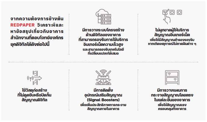 รายงาน REDPAPER ฉบับที่ 5 เรื่อง ไขรหัสความสำเร็จธุรกิจอาคารสำนักงาน: 3 กุญแจดอกใหม่สู่ Tomorrow’s Office ดึงดูดผู้เช่าเต็ม ผูกใจผู้ใช้บริการ ศึกษาปัจจัยที่ผู้ประกอบการและพนักงานให้ความสำคัญสำหรับ “ออฟฟิศแห่งอนาคต” ที่ตอบโจทย์ด้านความสะดวก ช่วยเสริมประสิทธิภาพการทำงานให้กับทั้งองค์กรและพนักงาน โดยจากการสำรวจผู้ประกอบการและชาวออฟฟิศในย่าน CBD ของกรุงเทพฯ พบว่า 3 ปัจจัยสำคัญอันดับต้นที่มีผลต่อประสิทธิภาพการทำงานและความพึงพอใจของกลุ่มผู้ตอบแบบสอบถาม คือ อาคารสำนักงานต้องตอบโจทย์ด้านดิจิทัล นวัตกรรม และ บรรยากาศสถานที่ทำงาน
