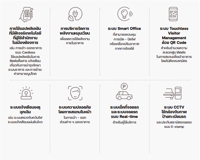 1) ความปลอดภัยของผู้ใช้อาคารสำคัญเป็นอันดับหนึ่ง ระบบเตือนภัย อุปกรณ์เซฟตี้คุณภาพ การฝึกซ้อมรับมือที่ได้มาตรฐาน รวมถึงการประยุกต์ระบบอัจฉริยะต่าง ๆ เพื่อเสริมประสิทธิภาพดูแลชีวิต-ทรัพย์สิน เป็นหนึ่งในบริการขั้นพื้นฐานที่ต้องรักษาคุณภาพไว้ในระดับสูง