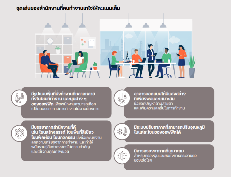 ช่วง Work from Home ที่ยาวนานเป็นจุดพลิกสำคัญของรูปแบบการทำงาน หลังกลับเข้าออฟฟิศ พนักงานให้ความสำคัญกับความสมดุลระหว่างการทำงานและการใช้ชีวิตมากขึ้น สะท้อนได้จากผลสำรวจที่พบว่า 73% ของพนักงานต้องการออฟฟิศที่มีบรรยากาศดี ส่งเสริมการทำงานได้อย่างมีประสิทธิภาพ พร้อมส่งเสริม Well-being หรือสุขภาวะการทำงานที่ดี