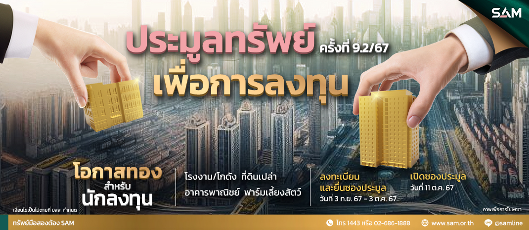 บริษัท บริหารสินทรัพย์สุขุมวิท จำกัด (บสส.) หรือ SAM เปิดเผยว่า ในวันที่ 27 ก.ย. และ 11 ต.ค.นี้ SAM จะจัดประมูลทรัพย์มือสอง หรือทรัพย์สินรอการขาย (NPA) ณ สำนักงานใหญ่ SAM ทั้งทรัพย์เพื่อการอยู่อาศัยและการลงทุน อาทิ บ้านเดี่ยว บ้านแฝด ทาวน์เฮ้าส์ ห้องชุดพักอาศัย อาคารพาณิชย์ ปั๊มน้ำมัน ที่ดินเปล่า โรงแรม/รีสอร์ท โรงงาน/โกดัง ฯลฯ รวมทั้งสิ้น 173 รายการ รวมมูลค่า 759 ล้านบาท ตอบโจทย์ผู้ที่ต้องการที่อยู่อาศัยและนักลงทุน พร้อมรับโปรโมชัน “SAM ทรัพย์มือสองต้องบอกต่อ” เพียงแนะนำทรัพย์ SAM ให้กับเพื่อนหรือคนรู้จัก รับค่าแนะนำสูงสุดถึง 3 ล้านบาทต่อ 1 รายการ นอกจากนี้ SAM ยังร่วมกับธนาคารชั้นนำ ทั้งธนาคารกรุงเทพ ธนาคารยูโอบี ธนาคารทีเอ็มบีธนชาต (ttb) ธนาคารกสิกรไทย และธนาคารอาคารสงเคราะห์ (ธอส.) จัด “สินเชื่อบ้าน” อัตราดอกเบี้ยพิเศษ เริ่มต้น 1.99% ต่อปี ผ่อนนานสูงสุด 30 ปี เงื่อนไขเป็นไปตามที่ธนาคารกำหนด