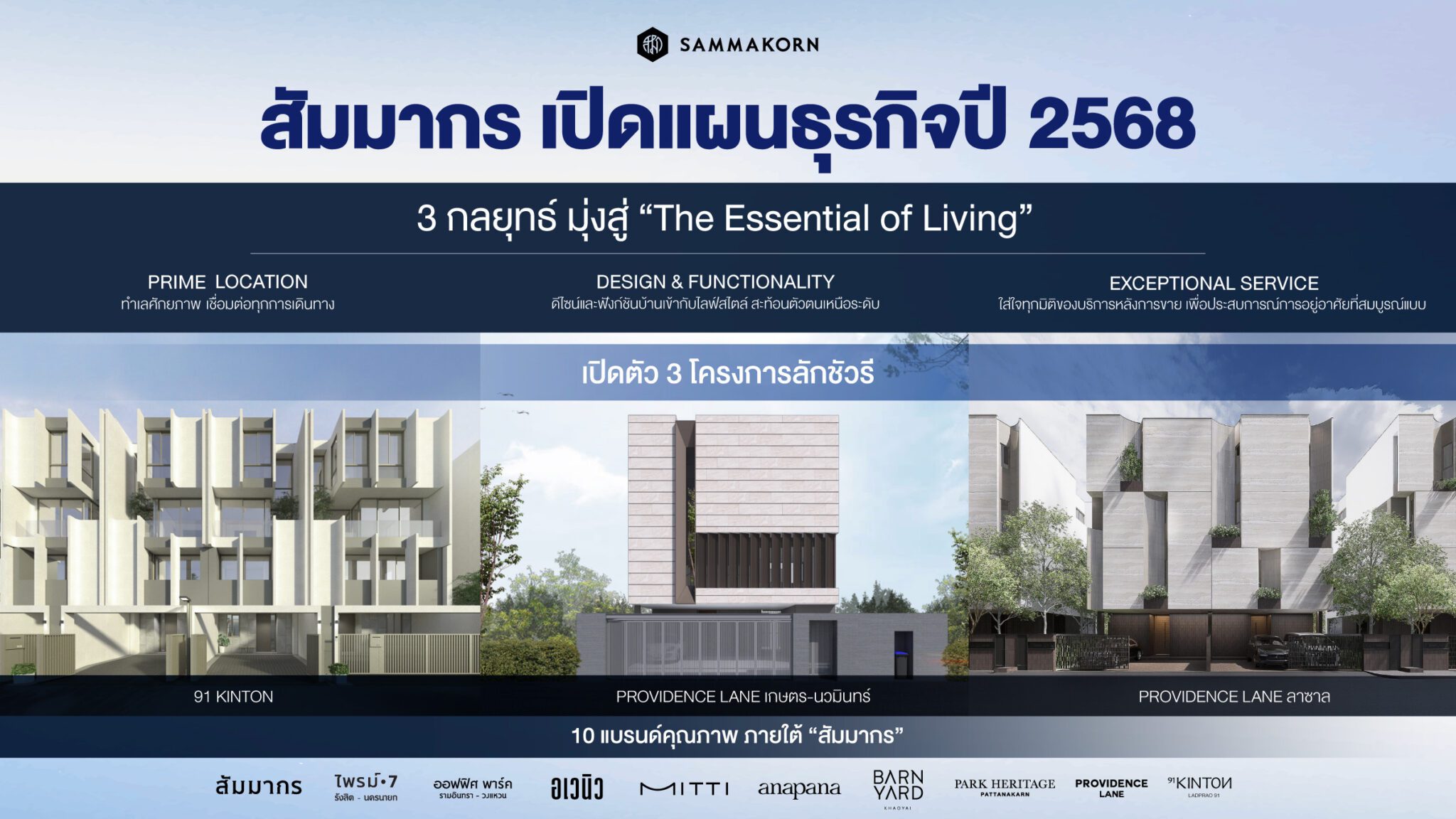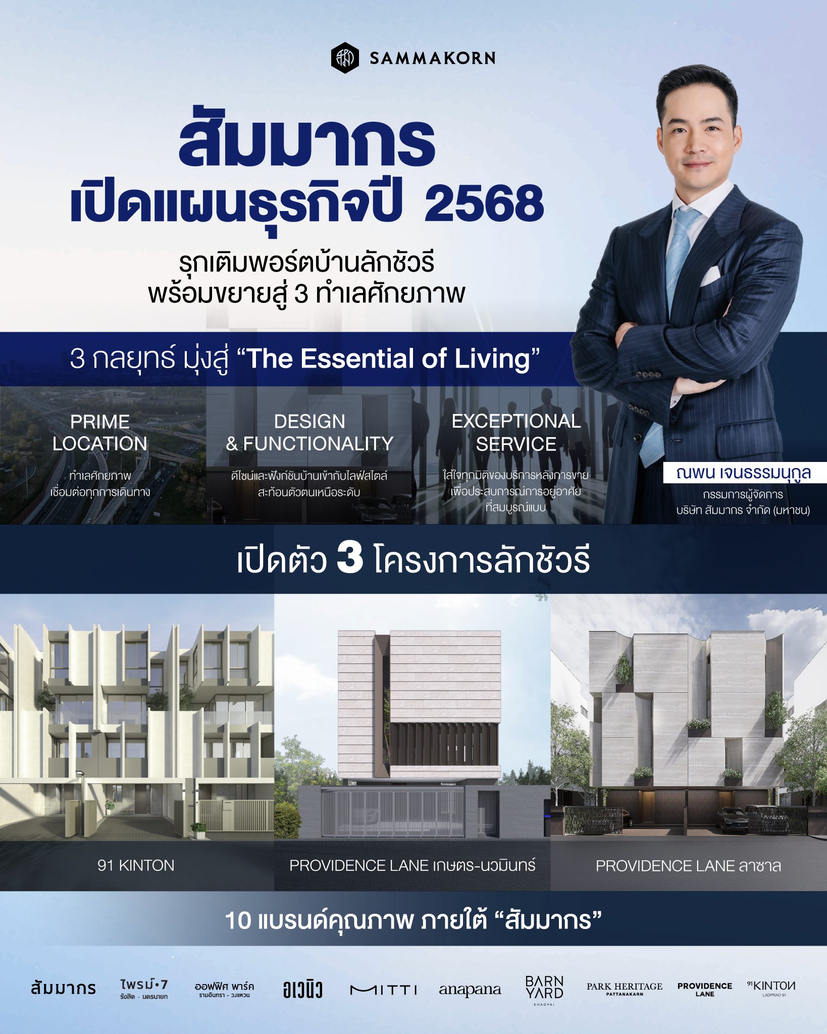 55 ปีแห่งการเติบโตอย่างมั่นคงและยั่งยืนของบริษัท สัมมากร จำกัด (มหาชน) ผู้พัฒนาอสังหาริมทรัพย์แบรนด์ไทยที่ได้รับความเชื่อถือและไว้วางใจมาโดยตลอด กับ 27 รางวัลแห่งความสำเร็จจากเวทีในประเทศและระดับโลก ภายใต้แคมเปญ “สัมมากร…ไม่ใช่สรรพากร” ที่สร้างความน่าจดจำและชวนให้นึกถึงแบรนด์ในแง่มุมสนุกกว่าที่เคย เผยถึงทิศทางธุรกิจปี 2568 ฝ่ามรสุมช่วงตลาดอสังหาฯ ชะลอตัว ปักธง 3 ทำเลศักยภาพ เกษตร-นวมินทร์ และ ลาซาล จากแบรนด์ “Providence Lane” และโครงการใหม่ในซอยลาดพร้าว 91 กับโครงการ “91 KINTON” พร้อมตั้งเป้าสร้างรายได้เติบโตขึ้น 60% จากปี 2567