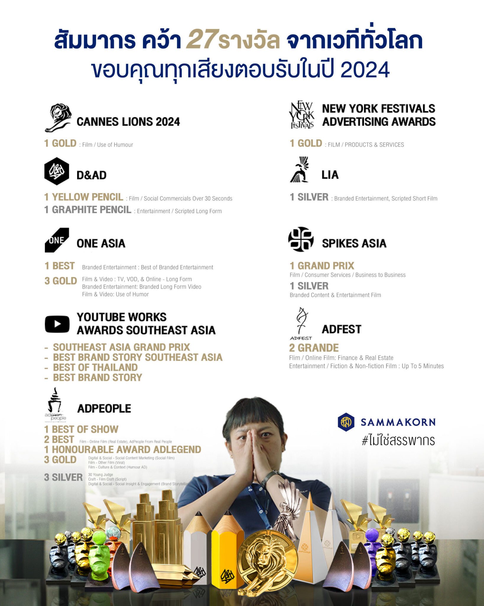 นายณพน เจนธรรมนุกูล กรรมการผู้จัดการ บริษัท สัมมากร จำกัด (มหาชน) เปิดเผยว่า “ปี 2567 ที่ผ่านมาด้วยปัจจัยทางเศรษฐกิจกำลังซื้อที่ถดถอย หนี้ครัวเรือนอยู่ในระดับสูง อัตราดอกเบี้ยที่ไม่จูงใจ ตลอดจนความเข้มงวดจากนโยบายการให้สินเชื่อ ส่งผลด้านลบต่อภาพรวมธุรกิจอสังหาริมทรัพย์ ทำให้รายได้เฉลี่ยปรับลดลงตามภาวะตลาดชะลอตัว ซึ่งล้วนเป็นปัจจัยที่หลีกเลี่ยงไม่ได้ แต่เรายังคงเดินหน้าพร้อมส่งมอบบ้านแก่ลูกค้าและเปิดโครงการใหม่อย่างต่อเนื่อง นอกจากนี้ ปีที่ผ่านมาเป็นอีกปีแห่งความภูมิใจที่สามารถคว้ารางวัลมากมายจากเวทีในประเทศและระดับโลกถึง 27 รางวัลภายใต้แคมเปญ “สัมมากร…ไม่ใช่สรรพากร” อาทิ รางวัล Gold จาก Cannes Lions 2024 สาขา Film ในหมวด Use of Humour และรางวัล Gold จาก New York Festivals Advertising Awards สาขา Film ในหมวด Product & Services