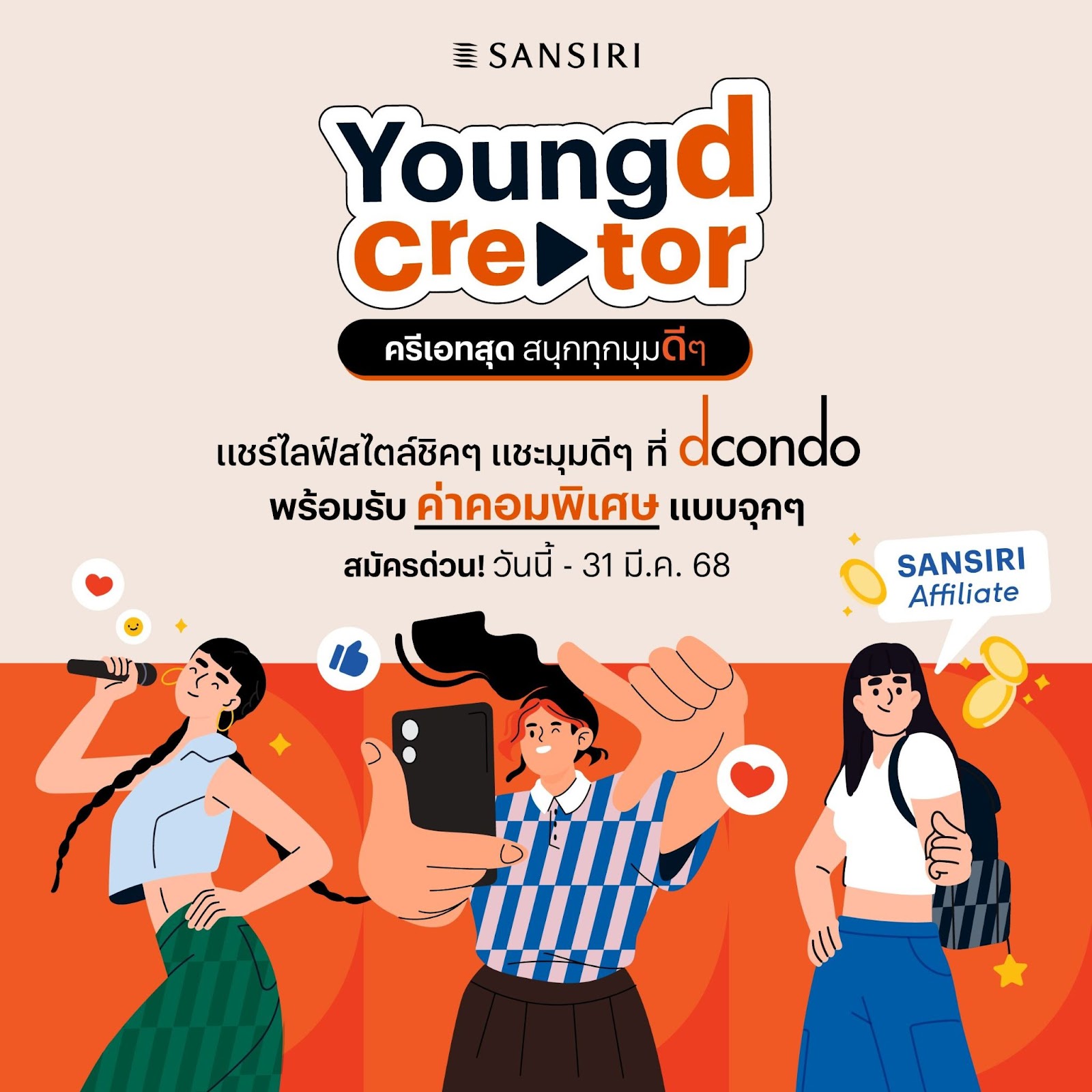 เปิดเวทีให้ครีเอเตอร์รุ่นใหม่ไฟแรง กลุ่มนักเรียนและนักศึกษา อายุระหว่าง 18-22 ปี ปล่อยพลังโชว์ความครีเอทีฟได้อย่างไร้ขีดจำกัด ผ่านการนำเสนอคอนเทนต์ไลฟ์สไตล์ชีวิตมหาลัยสุดชิคในหลากหลายรูปแบบ อาทิ สายไลฟ์สไตล์ สายบิ้วตี้ บล็อกเกอร์ สายกินและสายอื่นๆ ตามความถนัดของครีเอเตอร์ พร้อมบอกเล่าการใช้ชีวิตดีๆ รอบด้านกับดีคอนโด 10 โครงการ พร้อมโพสต์คลิปวิดีโอลงช่องทางโซเชียลมีเดีย ไม่ว่าจะเป็น Facebook, TikTok, Instagram และ X เพื่อสร้างการรับรู้แบรนด์และสร้างการตัดสินใจซื้อในตัวโปรดักส์ของแสนสิริให้โดนใจกลุ่มเป้าหมายได้อย่างตรงจุด รวมถึงสานต่อความสำเร็จ Sansiri Affiliate ทำจริง รับค่าตอบแทนจริง สร้างรายได้พิเศษจากค่าคอมมิชชันเรทพิเศษสูงสุดถึง 40,000 บาท* เฉพาะในช่วง 2 เดือนของแคมเปญนี้เท่านั้น เริ่มตั้งแต่วันนี้ – 31 มีนาคม 2568 เท่านั้น