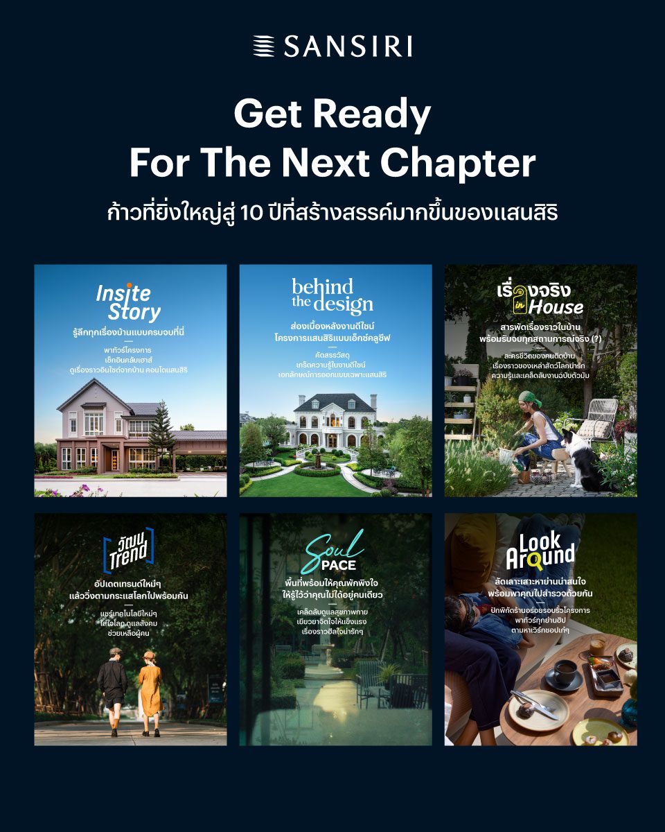 • ก้าวสู่ปีที่ 10 อย่างแข็งแกร่งและสร้างสรรค์ยิ่งขึ้น แสนสิริขอ “เล่นใหญ่” กว่าที่เคย เปิดตัวคลังคอนเทนต์แห่งยุค พร้อม 6 คอลัมน์ใหม่ที่ครอบคลุมทุกมิติของชีวิต ไม่ว่าจะเป็นบ้าน ดีไซน์ ไลฟ์สไตล์ ท่องเที่ยว หรือสุขภาพ เสริมด้วยคอนเทนต์รูปแบบใหม่ที่กำลังมาแรง ทั้ง Podcast, Music Therapy, รายการท่องเที่ยวที่ทำร่วมกับค่ายนักแสดงซีรีส์วายแถวหน้าอย่าง Domundi รวมถึง “ละครคุณธรรม” ที่จะเล่าบริการหลังการขายในแบบสนุก ครบ และเข้าใจง่ายกว่าที่เคย