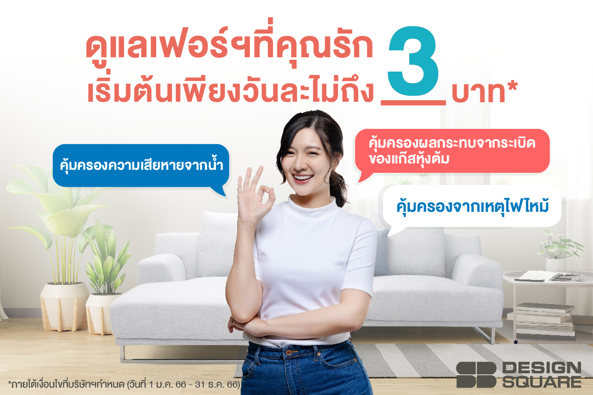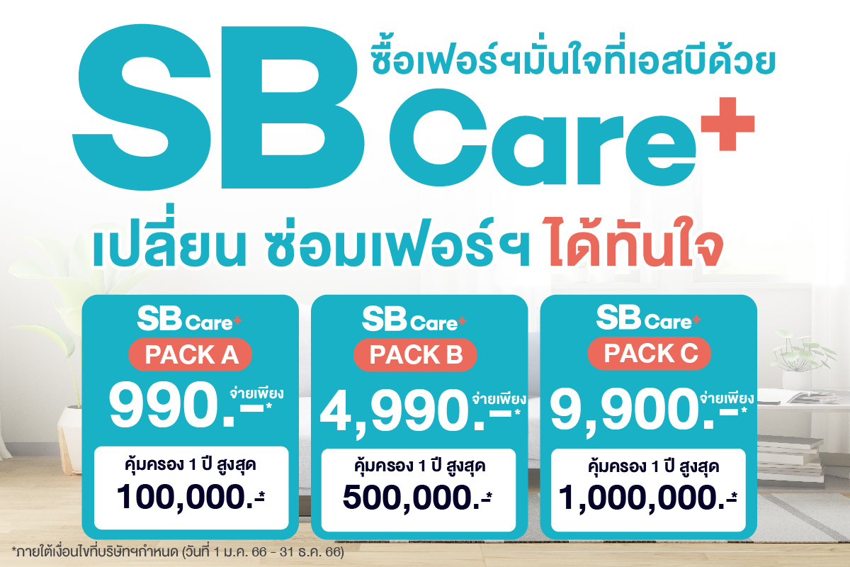 เอสบี ดีไซน์สแควร์ อัพเกรดแพคเกจความคุ้มครอง SB Care+ มิติใหม่ของวงการเฟอร์นิเจอร์ไทย ที่ช่วยดูแลและคุ้มครองเฟอร์นิเจอร์ที่เสียหายจากเหตุไฟไหม้ เสียหายจากน้ำ รวมทั้งการระเบิดของแก๊สหุงต้ม ซ่อมเฟอร์นิเจอร์ให้ฟรี หากไม่สามารถซ่อมได้สามารถแลกซื้อเฟอร์นิเจอร์ใหม่รับส่วนลด 50% จากราคาเฟอร์นิเจอร์เดิมที่เสียหาย สะดวก ง่าย คุ้มค่า ด้วยแพคเกจเริ่มต้นเพียงวันละไม่ถึง 3 บาท