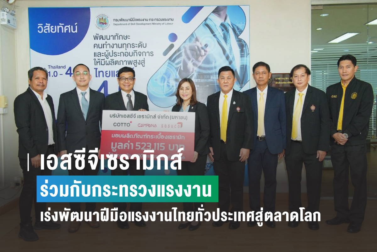 นายณัฏฐ์ เจนสิราสุรัชต์ Technical Services Manager (ที่ 3 จากซ้าย) บริษัทเอสซีจี เซรามิกส์ จำกัด (มหาชน)(ที่ 3 จากซ้าย) ผู้ผลิตและจำหน่ายกระเบื้องชั้นนำของไทยภายใต้แบรนด์ “คอตโต้” (COTTO) โสสุโก้ (SOSUCO) และ คัมพานา (CAMPANA) ร่วมมือกับกรมพัฒนาฝีมือแรงงาน (กพร.) กระทรวงแรงงานในการพัฒนาฝีมือแรงงานช่างปูกระเบื้องทั่วประเทศ ตามแผนฝึกอบรมประจำปี 2566 จำนวน 20 แห่ง โดยมีเป้าหมายร่วมกันในการเร่งพัฒนาศักยภาพของช่างให้มีทักษะ ความรู้ ความชำนาญ ในการปูกระเบื้องได้อย่างถูกต้องได้มาตรฐาน ให้เท่าทันกับการเปลี่ยนแปลงของเทคโนโลยีและความต้องการของตลาดแรงงานทั้งในประเทศและต่างประเทศ เพื่อรองรับต่อการขยายตัวของระบบเศรฐกิจในอนาคต พร้อมส่งมอบผลิตภัณฑ์กระเบื้องเซรามิก จำนวน 2,285 ตารางเมตร มูลค่า 523,115 บาท เพื่อให้กรมพัฒนาฝีมือแรงงานนำไปใช้ประโยชน์ในการฝึกฝน โดยมีนางสาวบุปผา เรืองสุด อธิบดีกรมพัฒนาฝีมือแรงงาน (ที่ 5 จากขวา)เป็นผู้รับมอบ ณ ห้องประชุมปกรณ์ อังศุสิงห์ ชั้น 10 อาคารกรมพัฒนาฝีมือแรงงาน กระทรวงแรงงาน