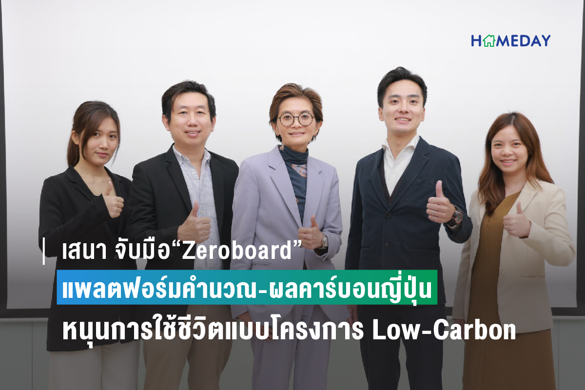 เสนา ประกาศเดินหน้าสู่องค์กร Net Zero เจ้าแรกในกลุ่มอสังหาฯ จับมือ “Zeroboard”บริษัทสตาร์อัพญี่ปุ่น ที่ใช้คลาวด์เทคโนโลยีในการคำนวณ และแสดงผลคาร์บอนหนุนการใช้ชีวิตแบบ โครงการ Low-Carbon