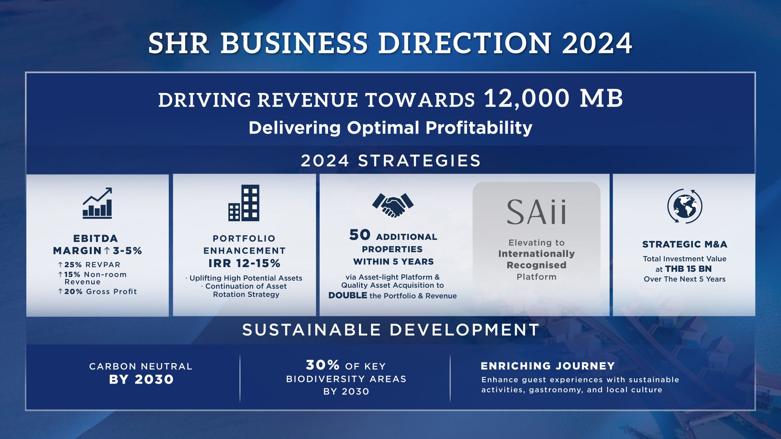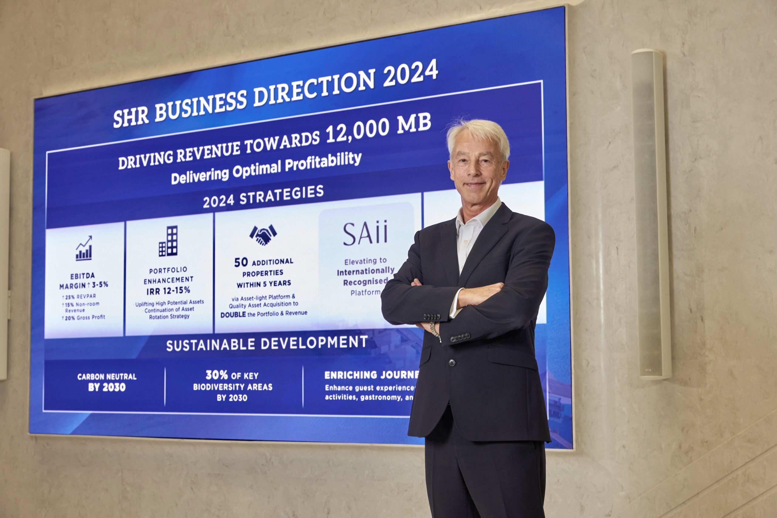 บริษัท เอส โฮเทล แอนด์ รีสอร์ท จำกัด (มหาชน) (SET: SHR) ผู้นำด้านธุรกิจโรงแรมและรีสอร์ทระดับนานาชาติ ในเครือ บริษัท สิงห์ เอสเตท จำกัด (มหาชน) (SET: S) ประกาศกลยุทธ์การดำเนินธุรกิจเพื่อยกระดับความสามารถในการสร้างกำไรต่อเนื่อง ตั้งเป้ารายได้ปี 2567 รวมมูลค่า 12,000 ล้านบาท รุกผลักดัน EBITDA Margin เติบโตร้อยละ 3 – 5 โดยมุ่งเพิ่มประสิทธิภาพการดำเนินงานเพื่อขับเคลื่อนผลกำไร ยกระดับพอร์ตโฟลิโอผ่านการปรับปรุงและเพิ่มมูลค่าโรงแรมในจุดหมายปลายทางสำคัญ ยกระดับแบรนด์ ทราย (SAii) เพื่อมอบประสบการณ์ที่ดีที่สุดแก่ผู้เข้าพัก ควบคู่กับการดำเนินธุรกิจบนโมเดล Asset–Light และขยายธุรกิจผ่านการซื้อและควบรวมกิจการ พร้อมสานต่อความมุ่งมั่นด้านความยั่งยืน เดินหน้าเติมเต็มประสบการณ์การเข้าพัก ด้วยกิจกรรมการเรียนรู้ และศาสตร์แห่งอาหารที่ผูกพันกับท้องถิ่น