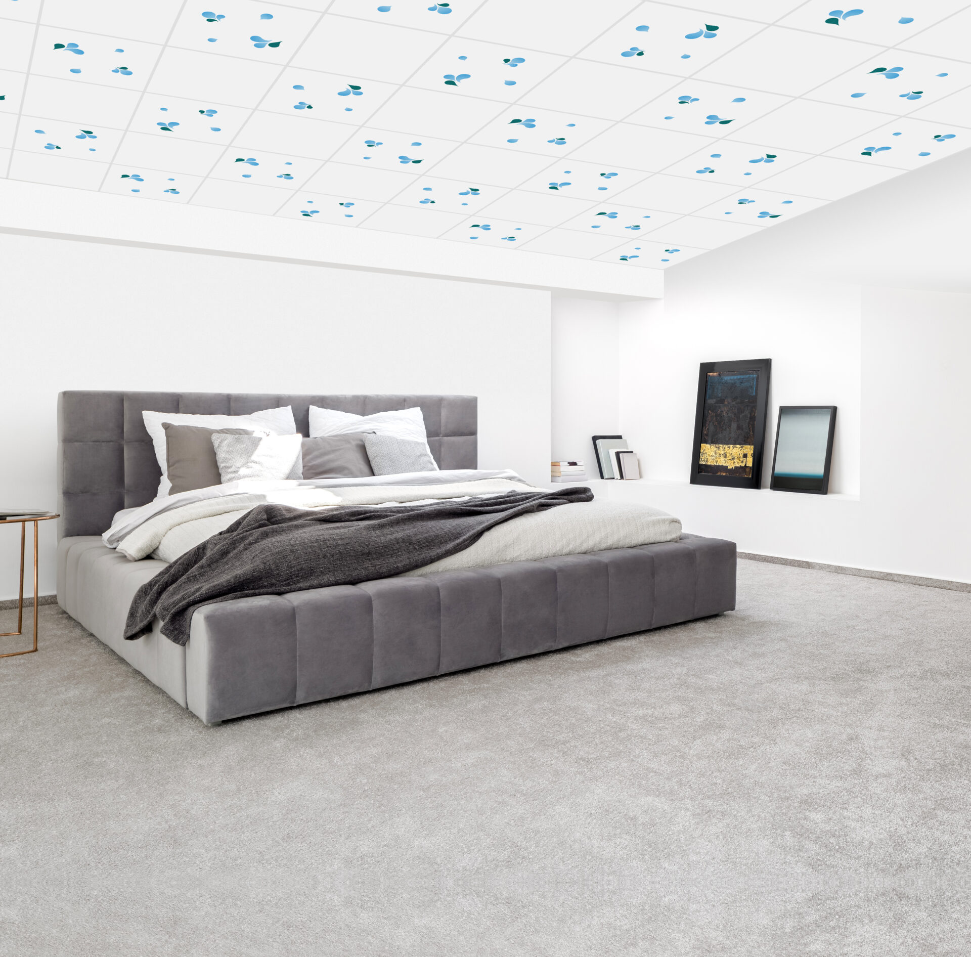 สีฟ้าเป็นสีโทนเย็นที่ให้ความรู้สึกสดใสและผ่อนคลายในเวลาเดียวกัน การใช้สีฟ้าบนฝ้าเพดานช่วยให้ผู้อยู่อาศัยรู้สึกสงบ ลดความเครียด สบายใจได้มากขึ้น ทั้งยังช่วยให้บรรยากาศภายในห้องดูเย็นสบาย ผ่อนคลายจากการวิตกกังวล หากใครไม่ต้องการทาสีทับฝ้าเดิม สามารถเปลี่ยนมาใช้ แผ่นฝ้าทีบาร์เปเปอร์ทัช ตราช้าง ลายหยาดฝน ที่มีลวดลายเหมาะแก่การสร้างบรรยากาศภายในบ้านให้ร่มเย็น และชุ่มฉ่ำราวกับอยู่ท่ามกลางละอองฝน เหมาะสำหรับห้องนอน หรือห้องนั่งเล่น