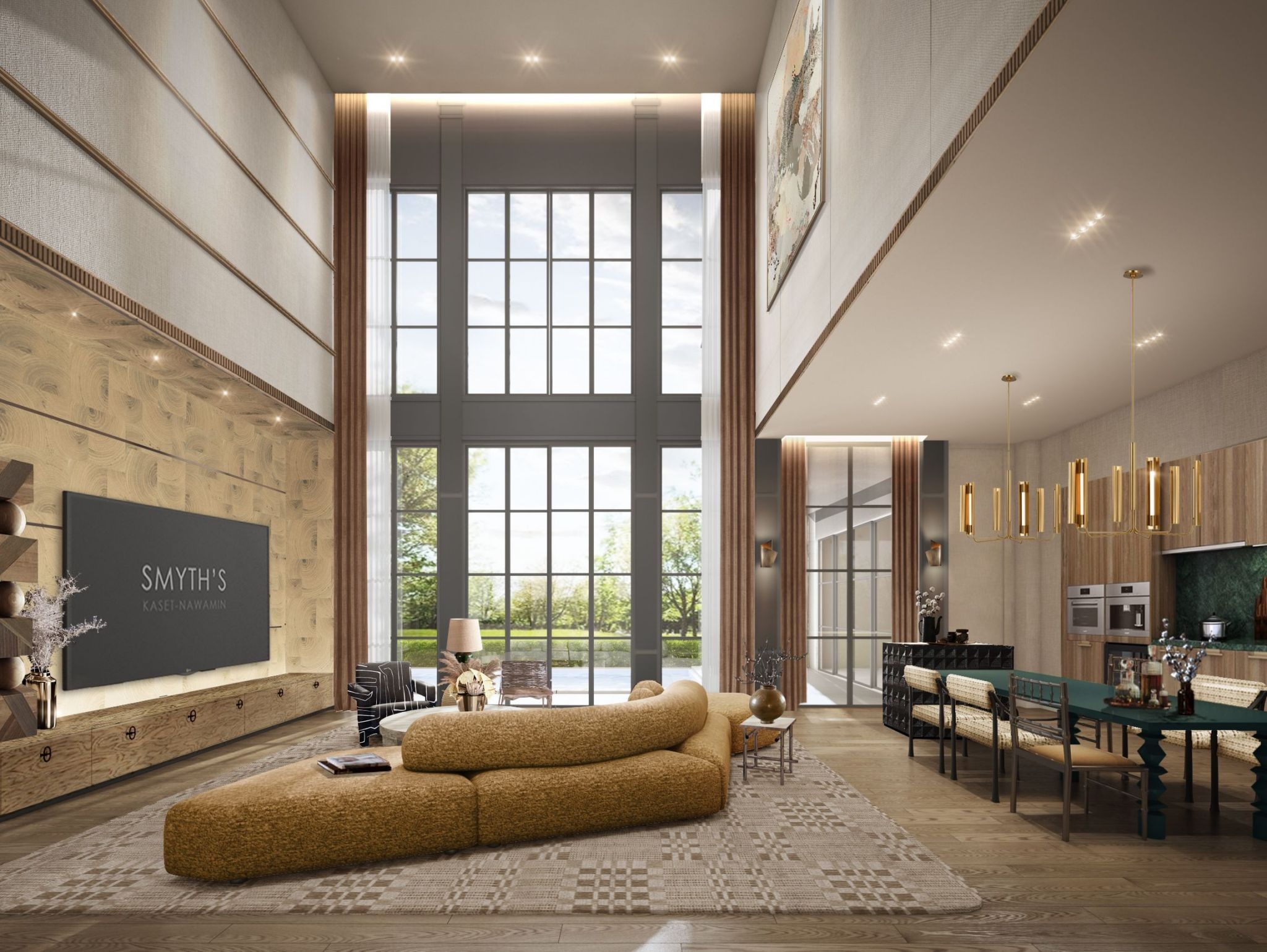 ผสานความทันสมัยของเมืองใหญ่ให้เข้ากับวิถีแห่งธรรมชาติ โดยได้รับแรงบันดาลใจจากปรัชญาเซน สถาปัตยกรรมที่เป็นเอกลักษณ์ด้วยการใช้วัสดุหิน อิฐ กระจก และโลหะในโทนสีน้ำตาล-เทา สร้างความโดดเด่นด้วยอลูมินัมชีทขึ้นรูปแทนระแนงไม้ สร้างผนังบังแดดและพรางสายตา สะท้อนถึงความเป็น Timeless ที่ยังคงความงามเหนือกาลเวลา การออกแบบภายในของ SMYTH’S RAMINTRA ให้ความสำคัญกับการสร้างสมดุลระหว่างพื้นที่ส่วนตัวและพื้นที่ส่วนกลางภายในบ้าน เพื่อตอบสนองความต้องการของทุกคนในครอบครัว ด้วยพื้นที่ใช้สอยมากถึง 999 ตารางเมตร จึงกว้างขวางเหมาะกับการ Work from Home อย่างแท้จริง