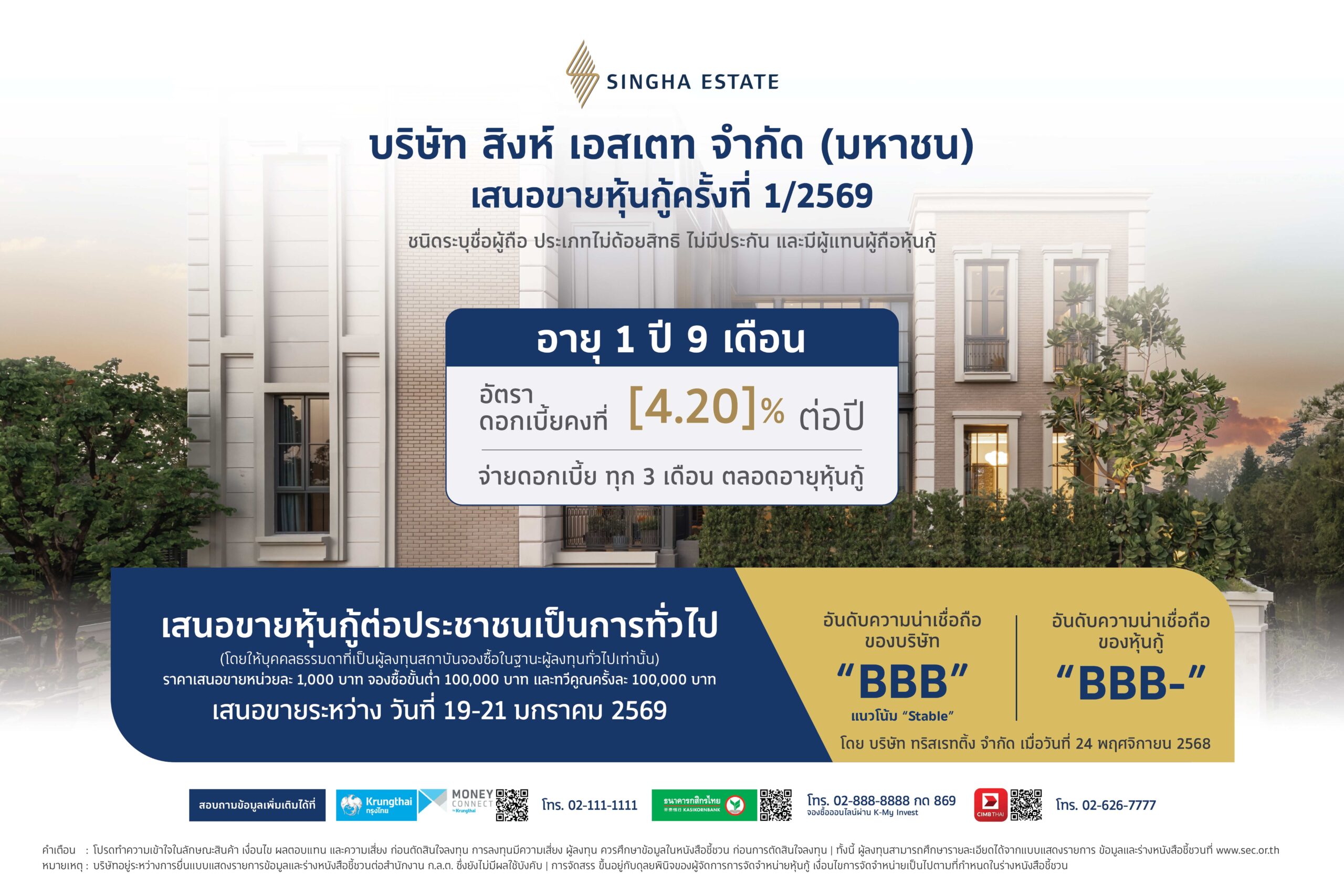 กรุงเทพฯ 26 พฤศจิกายน 2568 – หลังจากประสบความสำเร็จจากการเสนอขายหุ้นกู้ในครั้งก่อน บริษัท สิงห์ เอสเตท จำกัด (มหาชน) หรือ “S” เตรียมพร้อมที่จะเสนอขายหุ้นกู้ชุดใหม่ต่อประชาชนเป็นการทั่วไป โดยปัจจุบัน บริษัทฯ อยู่ระหว่างการยื่นแบบแสดงรายการข้อมูลตราสารหนี้ (filing) เพื่อเสนอขายหุ้นกู้ชนิดระบุชื่อผู้ถือ ประเภท ไม่ด้อยสิทธิ ไม่มีประกัน และมีผู้แทนผู้ถือหุ้นกู้ ต่อสำนักงานคณะกรรมการกำกับหลักทรัพย์และตลาดหลักทรัพย์ (ก.ล.ต.) โดยหุ้นกู้จะมีอายุ 1 ปี 9 เดือน อัตราดอกเบี้ย [4.20]% ต่อปี สำหรับหุ้นกู้ดังกล่าวจะชำระดอกเบี้ยทุกๆ 3 เดือน กำหนดจองซื้อขั้นต่ำ 100,000 บาท ทวีคูณครั้งละ 100,000 บาท โดยคาดว่าจะเสนอขายต่อประชาชนเป็นการทั่วไประหว่างวันที่ 19 – 21 มกราคม 2569 ทั้งนี้บริษัทฯ ได้แต่งตั้งสถาบันการเงิน 3 แห่ง เป็นผู้จัดการการจัดจำหน่ายหุ้นกู้ ประกอบด้วย ธนาคารกรุงไทย ธนาคารกสิกรไทย และธนาคาร ซีไอเอ็มบี ไทย