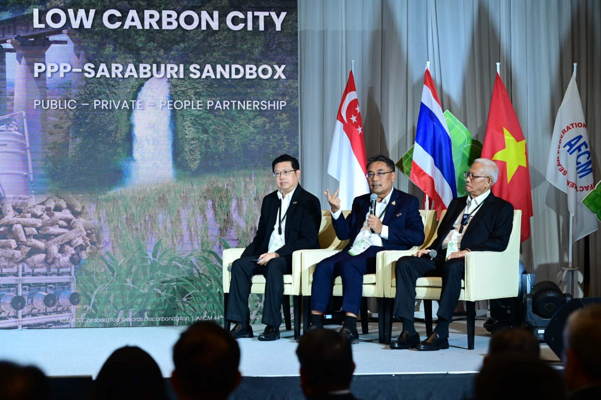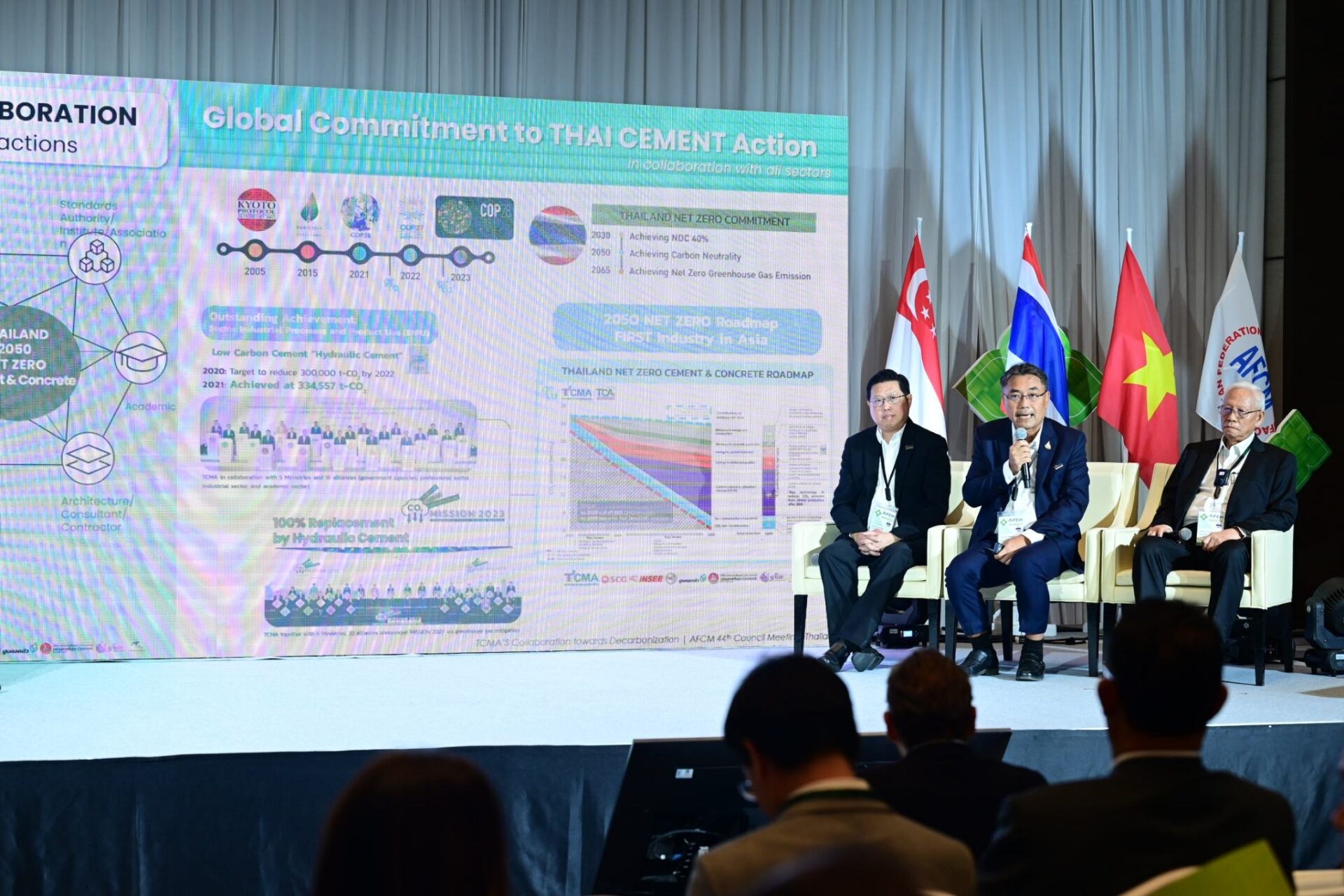 การประชุม AFCM ครั้งที่ 44 นี้ นอกจากจะเป็นการส่งเสริมความร่วมมือของผู้ผลิตอุตสาหกรรมปูนซีเมนต์ในอาเซียนแล้ว ยังเป็นการผสานความร่วมมือระหว่าง AFCM ผู้ผลิตปูนซีเมนต์ในอาเซียน กับองค์กรสำคัญระดับโลกด้านปูนซีเมนต์และคอนกรีต และภาครัฐของไทย ที่มีบทบาทสำคัญในการสนับสนุนและส่งเสริมอุตสาหกรรมให้มีความยั่งยืนควบคู่กับการดูแลสิ่งแวดล้อมและสังคม (ESG) พร้อมตอบโจทย์วิกฤติโลกเดือด โดยได้รับเกียรติจาก Mr. Thomas Guillot, Chief Executive of Global Cement and Concrete Association (GCCA) ซึ่งเป็นองค์กรระดับโลกด้านซีเมนต์และคอนกรีต ครอบคลุมกำลังการผลิตของทั้งโลกกว่า 80% รวมด้วยนายปวิช เกศววงศ์ รองอธิบดีกรมการเปลี่ยนแปลงสภาพภูมิอากาศและสิ่งแวดล้อม กระทรวงทรัพยากรธรรมชาติและสิ่งแวดล้อม และนายวรกาญจน์ โกศลพิศิษฐ์กุล ผู้อำนวยการกองส่งเสริม-การลงทุน 3 สำนักงานคณะกรรมการส่งเสริมการลงทุน และ ดร. ชนะ นายก TCMA พร้อมด้วยสมาชิก