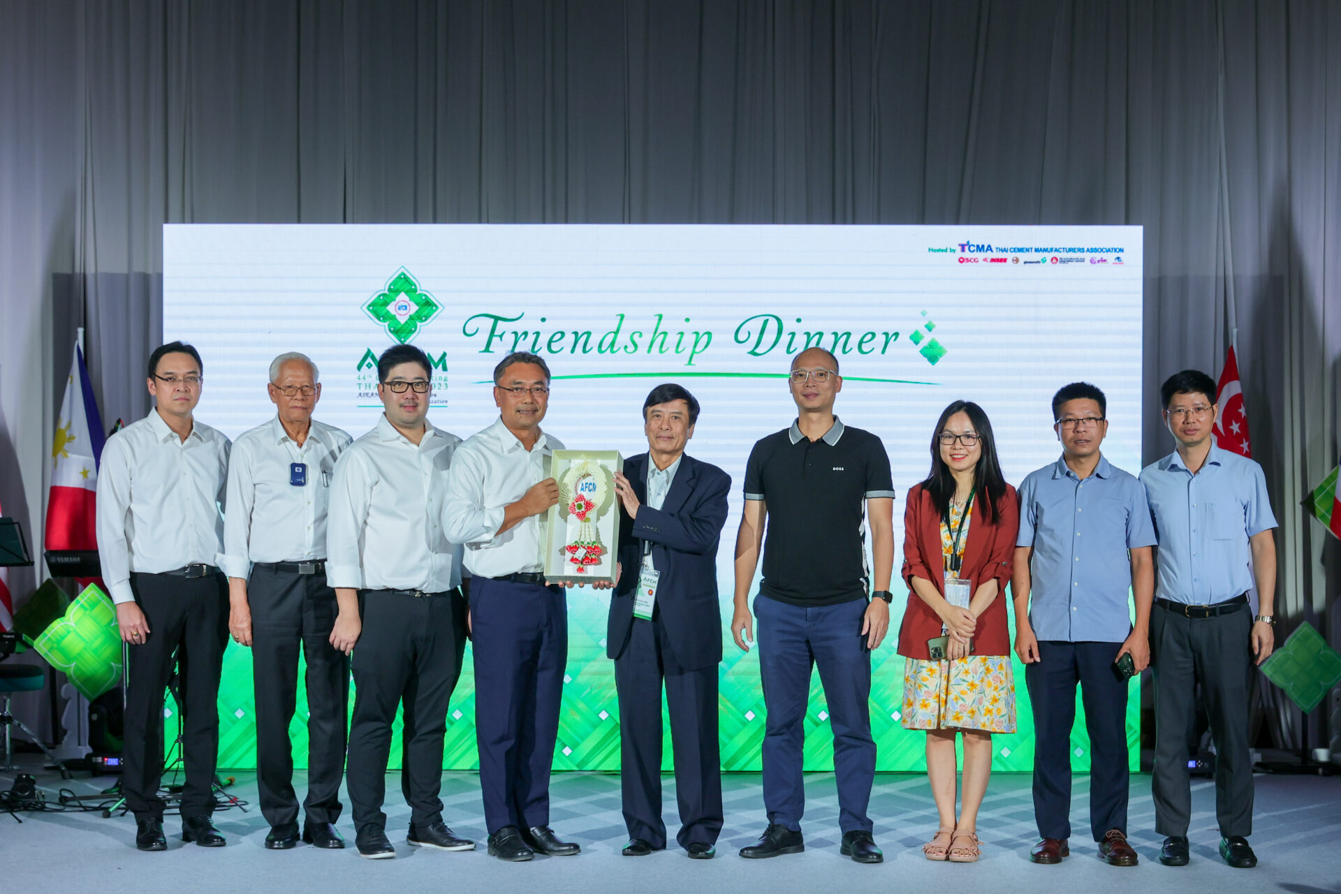 ดร. ชนะ นายก TCMA และสมาชิก TCMA ได้แก่ บจก. ภูมิใจไทยซีเมนต์ บมจ. ปูนซีเมนต์เอเชีย บมจ. ชลประทานซีเมนต์ บจก. ปูนซีเมนต์ตราลูกโลก บมจ. ทีพีไอ โพลีน บจก. เอสซีจี ซีเมนต์-ผลิตภัณฑก่อสร้าง และ บมจ. ปูนซีเมนต์นครหลวง ร่วมกันมอบพวงมาลัยประดับลายประจำยาม ให้เป็นของขวัญ และเป็นสัญลักษณ์ของความสามัคคีร่วมมือ ให้แก่เวียดนาม เพื่อส่งมอบการเป็นเจ้าภาพจัดการประชุม AFCM ครั้งที่ 45 ในปีถัดไป ถือเป็นการปิดฉากการประชุมสมาพันธ์ผู้ผลิตปูนซีมนต์แห่งอาเซียน ครั้งที่ 44 นี้ อย่างเป็นทางการ