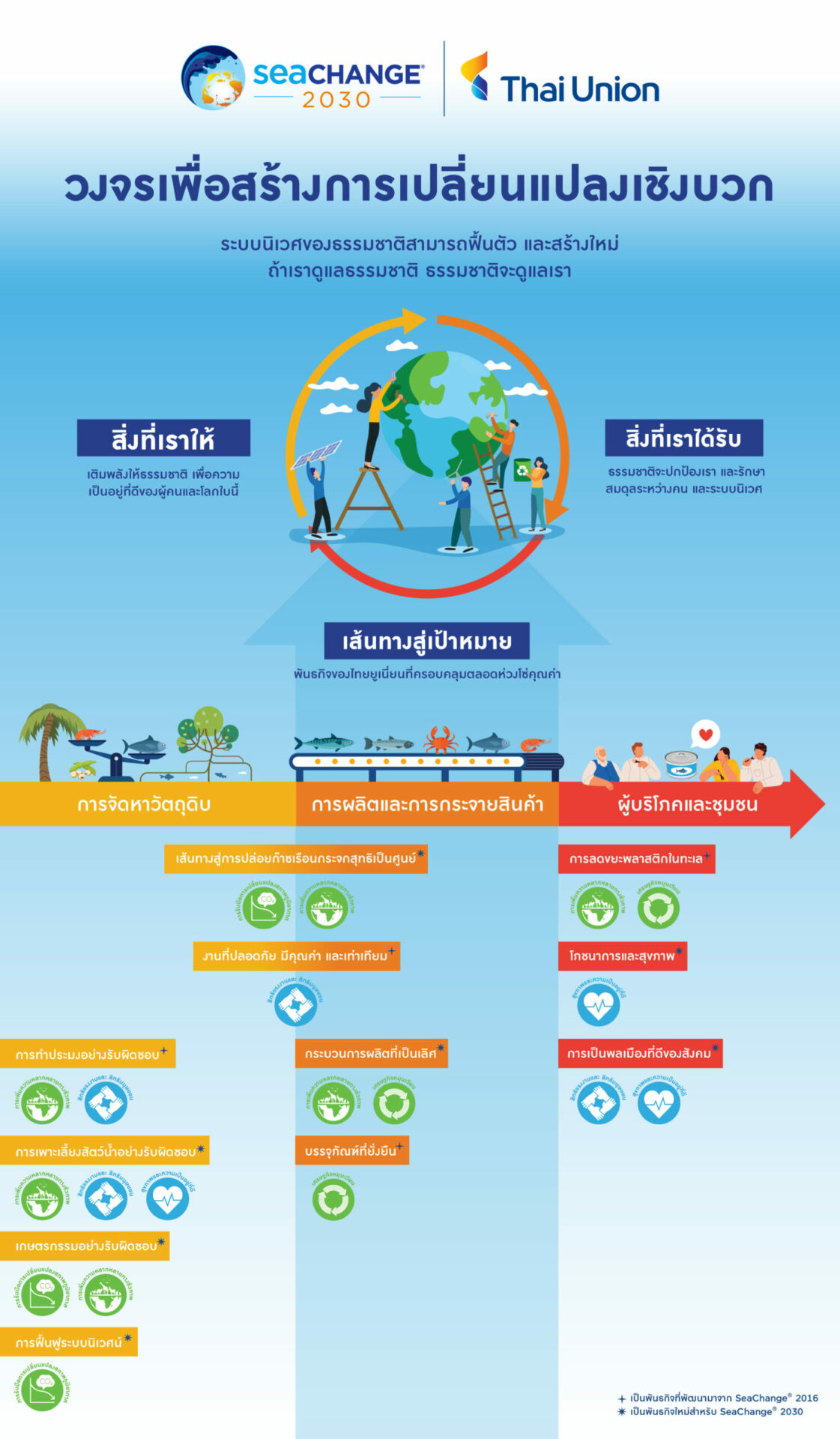 SeaChange® 2030 เป็นการต่อยอดและก้าวกระโดดจากกลยุทธ์ความยั่งยืนของบริษัทที่ประกาศครั้งแรกในปี 2559 และครั้งนี้ไทยยูเนี่ยนประกาศพันธกิจเพื่อความยั่งยืนทั้งสิ้น 11 ข้อ ที่ครอบคลุมการดูแลทั้งผู้คนและโลก โดยสอดคล้องกับเป้าหมายการพัฒนาที่ยั่งยืนขององค์การสหประชาชาติถึง 10 ประการด้วยกัน โดยพันธกิจทั้ง 11 ข้อของไทยยูเนี่ยน ได้แก่