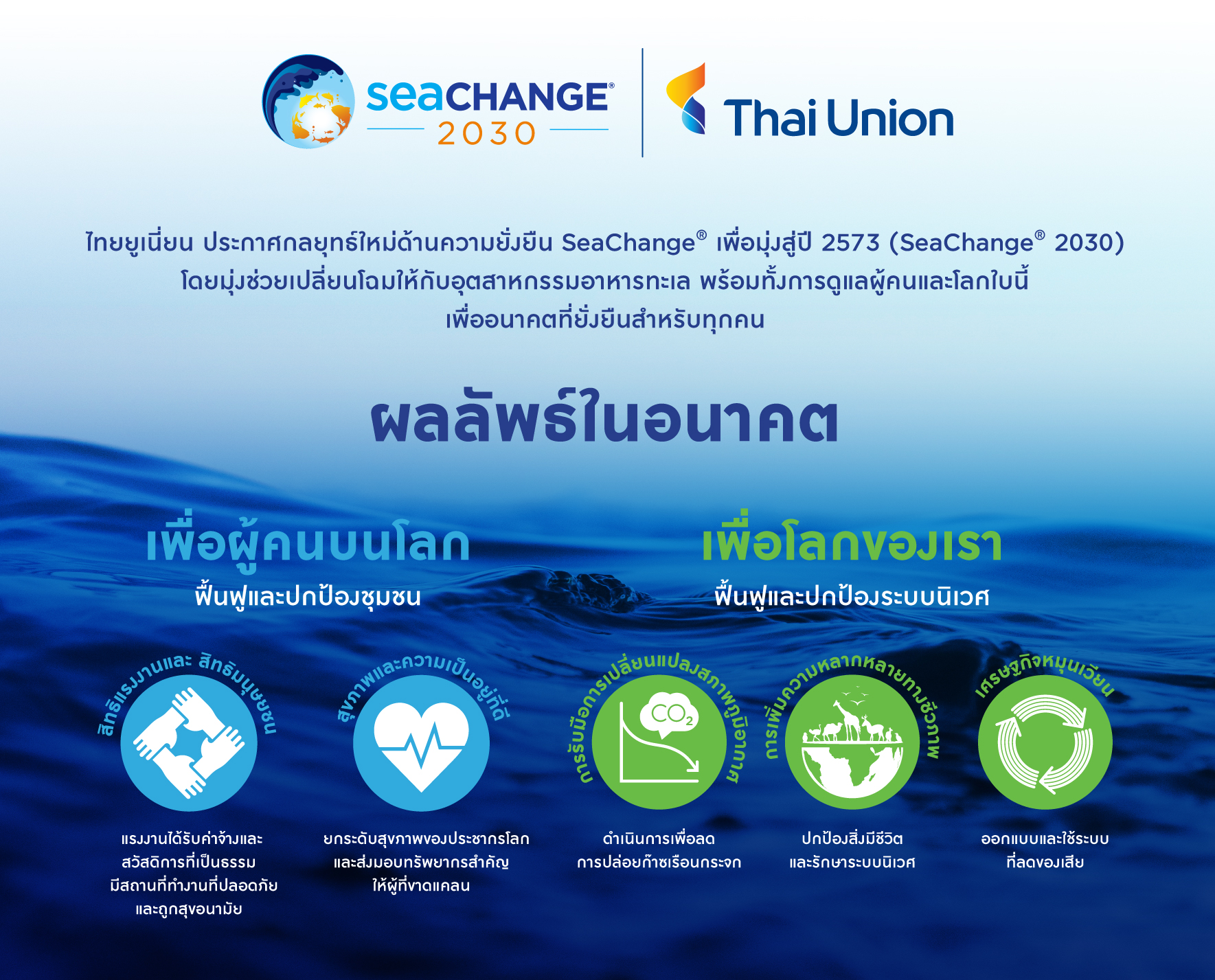 บริษัท ไทยยูเนี่ยน กรุ๊ป จำกัด (มหาชน) ประกาศกลยุทธ์ความยั่งยืน SeaChange® 2030 ซึ่งเป็นช่วงต่อจากกลยุทธ์เดียวกันที่ประกาศเมื่อปี 2559 เพื่อช่วยพลิกโฉมอุตสาหกรรมอาหารทะเล ด้วยการดูแลคนและโลกเพื่ออนาคตที่ยั่งยืน เพราะการเปลี่ยนแปลงสภาพภูมิอากาศได้กลายมาเป็นวาระเร่งด่วนของมนุษยชาติ ระบบนิเวศที่สำคัญตกอยู่ในความเสี่ยง ข้อมูลจากองค์การอาหารและเกษตรแห่งสหประชาชาติระบุว่า ประชากรโลกกว่า 600 ล้านคนพึ่งพามหาสมุทรเป็นแหล่งอาหารและใช้ในการประกอบอาชีพ ไม่ว่าจะโดยตรงหรือโดยอ้อม โดยเฉพาะประเทศกำลังพัฒนา
