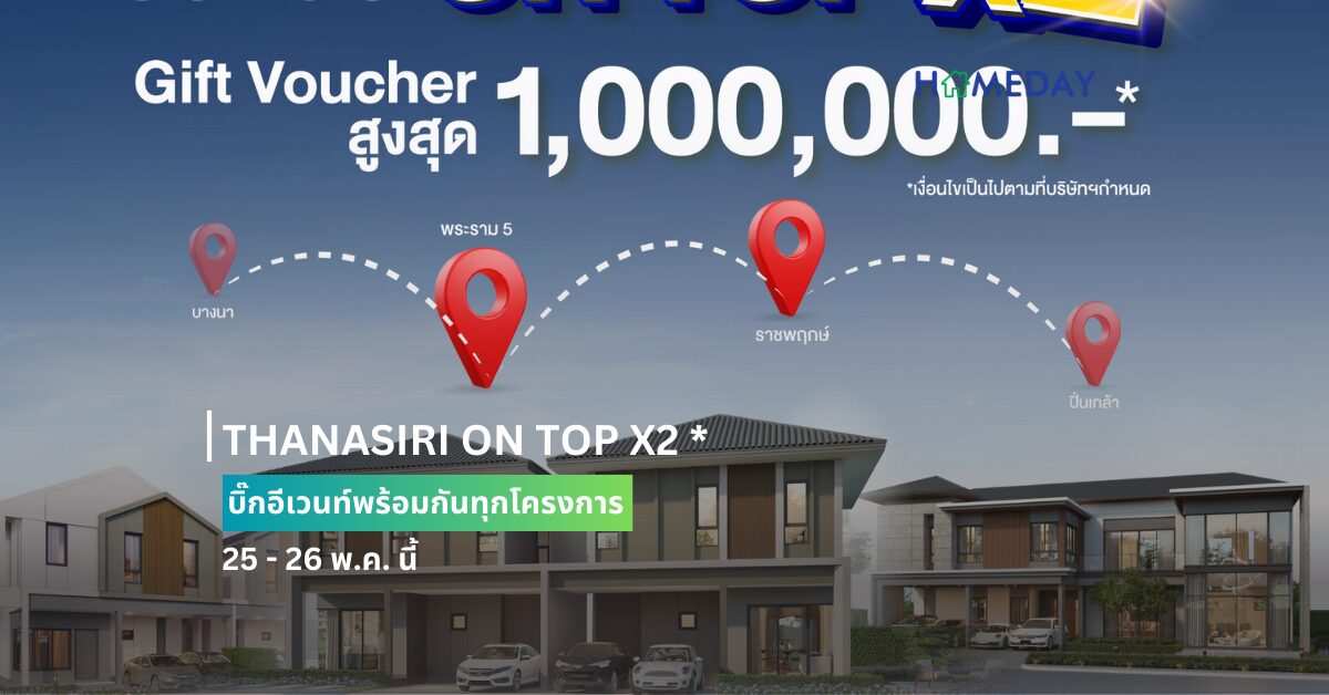 THANA พาเหรดโครงการบ้านพร้อมอยู่ ส่งบิ๊กอีเวนท์กระตุ้นตลาดอสังหาฯ หนุนโปร THANASIRI ON TOP X2 * ดีเดย์ 25 – 26 พ.ค. นี้ พร้อมคัดบ้านแปลงสวย บ้านเดี่ยว บ้านแฝด ทาวน์โฮม มูลค่ารวมกว่า 790 ล้านบาท พิเศษ!! มอบส่วนลดสูงสุด 1 ล้านบาท พร้อมโปรจุกๆ อีกเพียบ ครอบคลุมทุกโครงการ ผลักดันสู่เป้ายอดขายครึ่งปีแรก 1,000 ล้านบาท