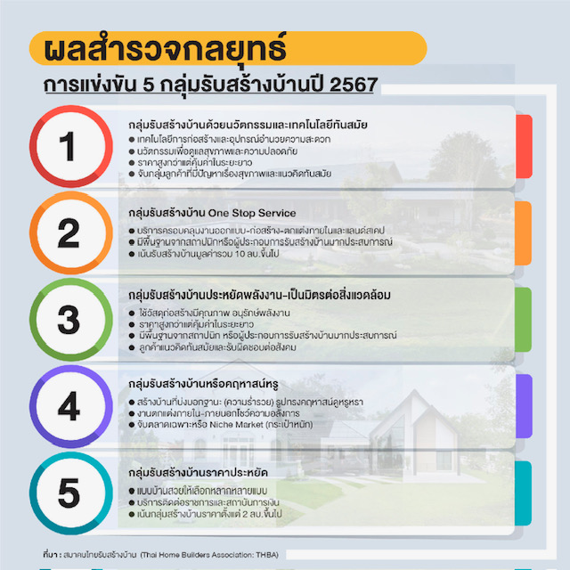 สมาคมไทยรับสร้างบ้าน (Thai Home Builders Association: THBA) โดย นายนิรัญ โพธิ์ศรี นายกสมาคมไทยรับสร้างบ้าน เผยผลสำรวจภาพรวมการแข่งขันตลาดรับสร้างบ้านพบว่า กลยุทธ์การตลาดที่ผู้ประกอบการรับสร้างบ้านนำมาใช้แข่งขันหรือจับกลุ่มลูกค้าเป้าหมายของตัวเองมีความหลากหลายแตกต่างกันไป โดยสามารถแบ่งออกได้เป็น 5 กลุ่มหลัก ๆ ได้แก่ 1.กลุ่มรับสร้างบ้านด้วยนวัตกรรมและเทคโนโลยีทันสมัย 2.กลุ่มรับสร้างบ้าน One Stop Service (ออกแบบ-สร้างบ้าน ตกแต่งภายใน จัดสวน) 3.กลุ่มรับสร้างบ้านประหยัดพลังงานและเป็นมิตรต่อสิ่งแวดล้อม 4.กลุ่มรับสร้างบ้านหรือคฤหาสน์หรู และสุดท้าย 5.กลุ่มรับสร้างบ้านราคาประหยัด