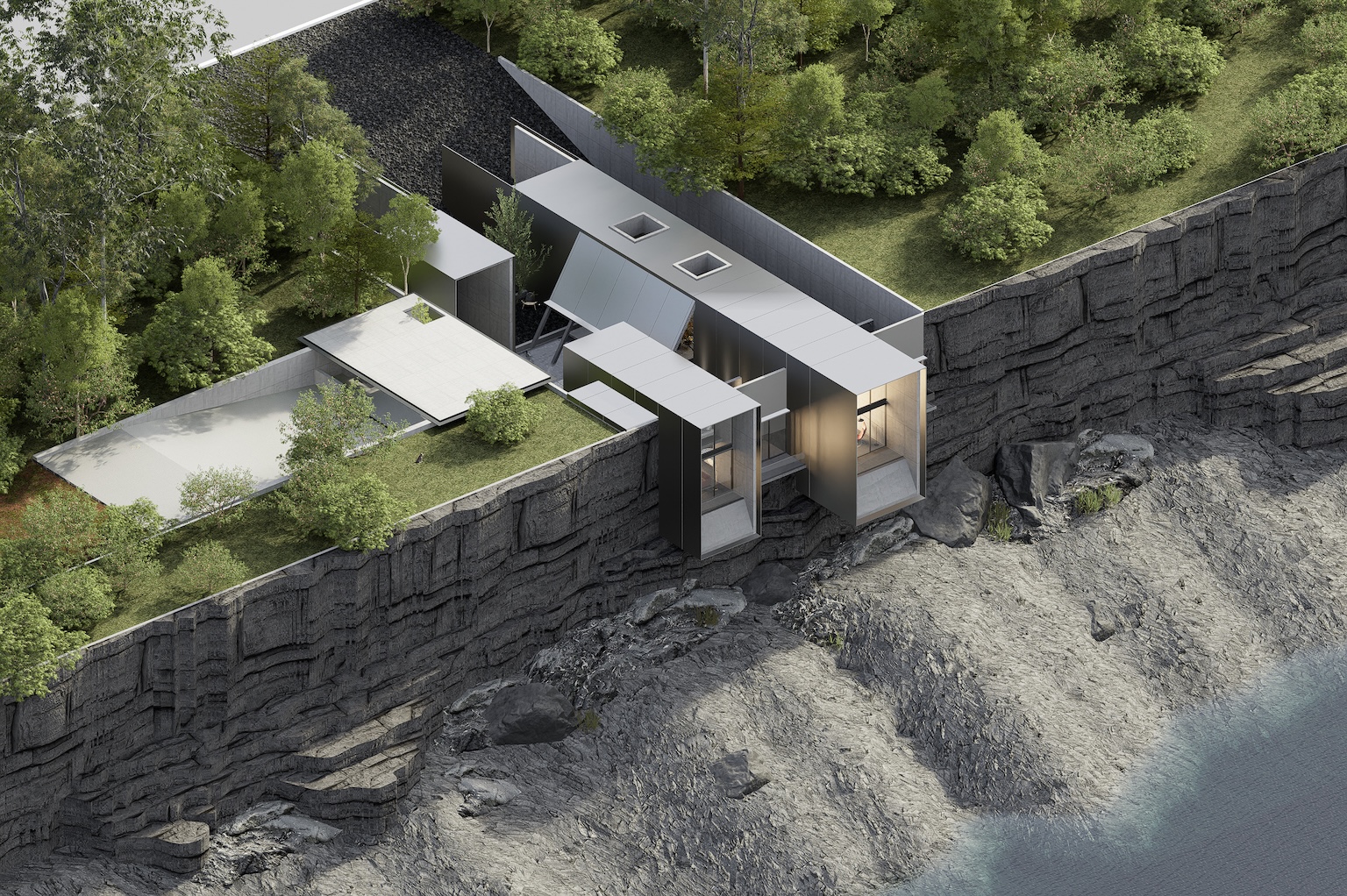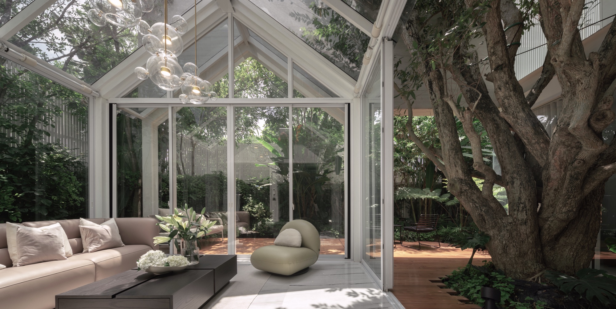 ผลงานการออกแบบโครงการรีโนเวทในกรุงเทพฯ ภายใต้แนวคิด “เมื่อความเป็นส่วนตัวมาบรรจบกับผืนป่า” สถาปนิกเลือกปรับปรุงโครงสร้างเดิมให้กลายเป็นประสบการณ์ใหม่ โดยใช้ผนังมีรูพรุนเป็น “ม่าน” กรองแสง ลม และมุมมอง สร้างความเป็นส่วนตัวโดยไม่ตัดขาดจากบริบทโดยรอบ การเชื่อมต่อระหว่างพื้นที่ภายในและสวนผ่านผนังกระจกขนาดใหญ่ ทำให้บ้านดู “หายใจได้” ไปพร้อมธรรมชาติ